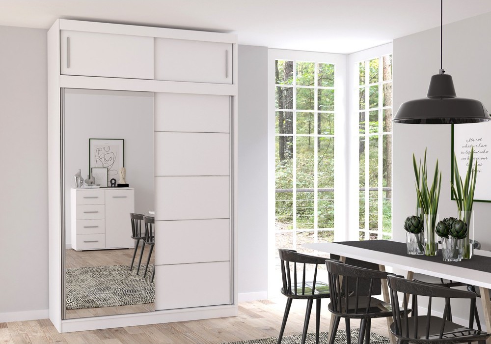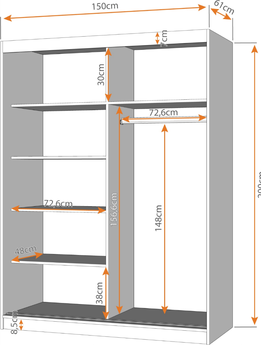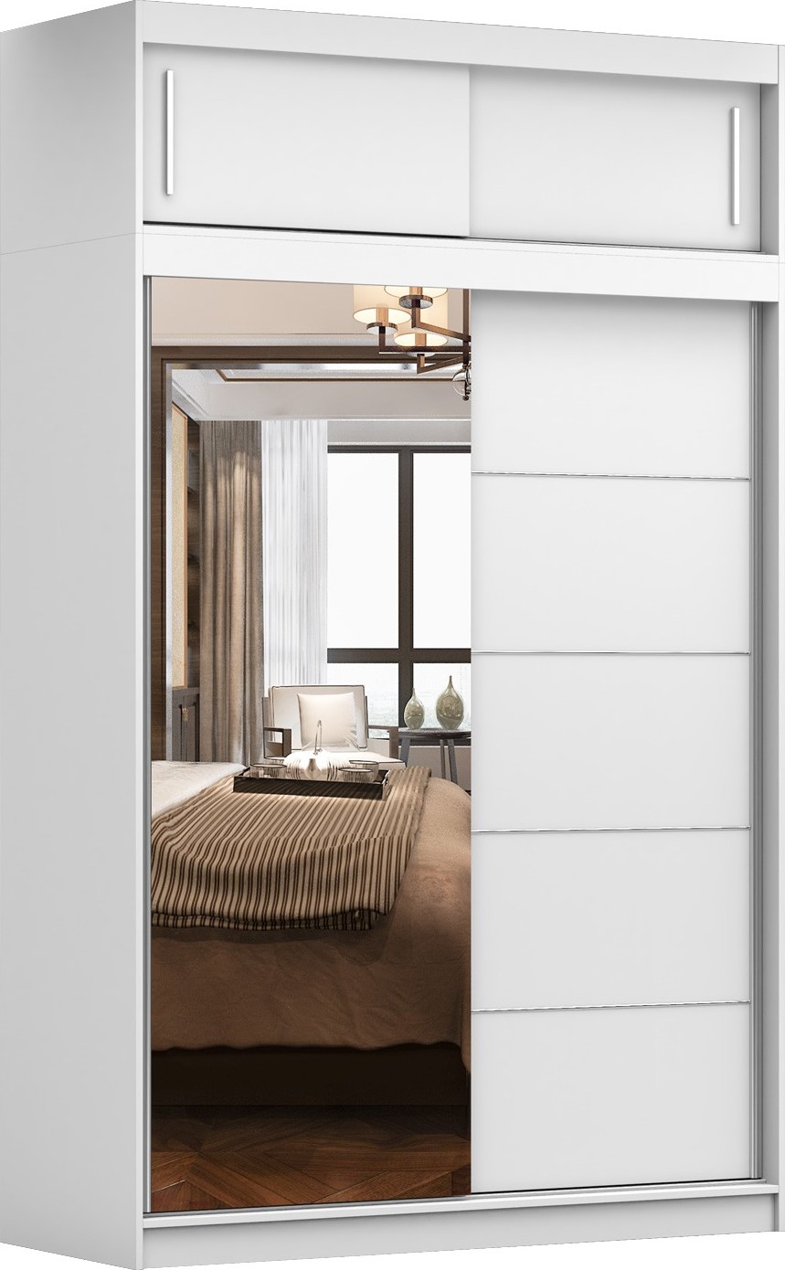 VICTOR 150 je kompaktná a elegantná šatníková skriňa s ozdobnými lištami a veľkým zrkadlom, ktoré opticky zväčšuje a rozjasňuje miestnosť. Skriňa je rozdelená na dve časti, ktoré sú vybavené priestrannými policami a závesnou tyčou na uloženie veľkého množstva oblečenia, čo z nej robí praktickú voľbu pre každú domácnosť. Skriňa disponuje rozšíreným úložným priestorom v hornej časti a je vybavená systémom posuvných dverí, ktorý uľahčuje jej používanie a nezaberá miesto. Veľká kapacita a funkčnosť v kombinácii s moderným dizajnom - to sú hlavné vlastnosti každej šatníkovej skrine VICTOR.