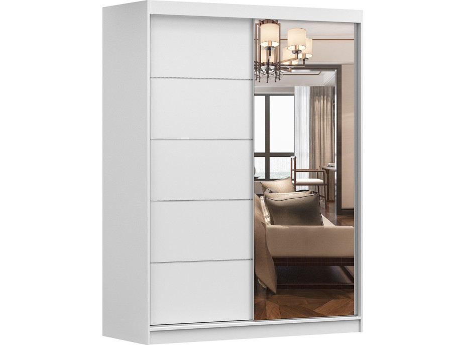 Skriňa je rozdelená na dve časti, ktoré sú vybavené nielen priestrannými policami a závesnou tyčou, ale aj dostatočným priestorom na uloženie veľkého množstva oblečenia, čo z nej robí praktickú voľbu pre každú domácnosť. Na prednej strane je umiestnené zrkadlo, ktoré osvetľuje miestnosť a opticky ju zväčšuje.