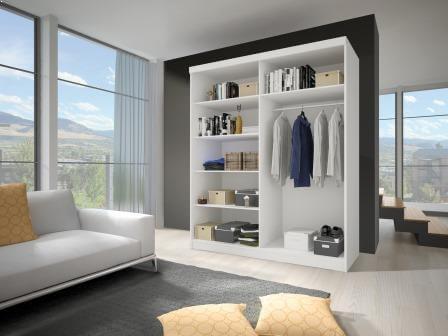 Skriňa je rozdelená na dve časti, ktoré sú vybavené nielen priestrannými policami a závesnou tyčou, ale aj dostatočným priestorom na uloženie veľkého množstva oblečenia, čo z nej robí praktickú voľbu pre každú domácnosť. Na prednej strane je umiestnené zrkadlo, ktoré osvetľuje miestnosť a opticky ju zväčšuje.