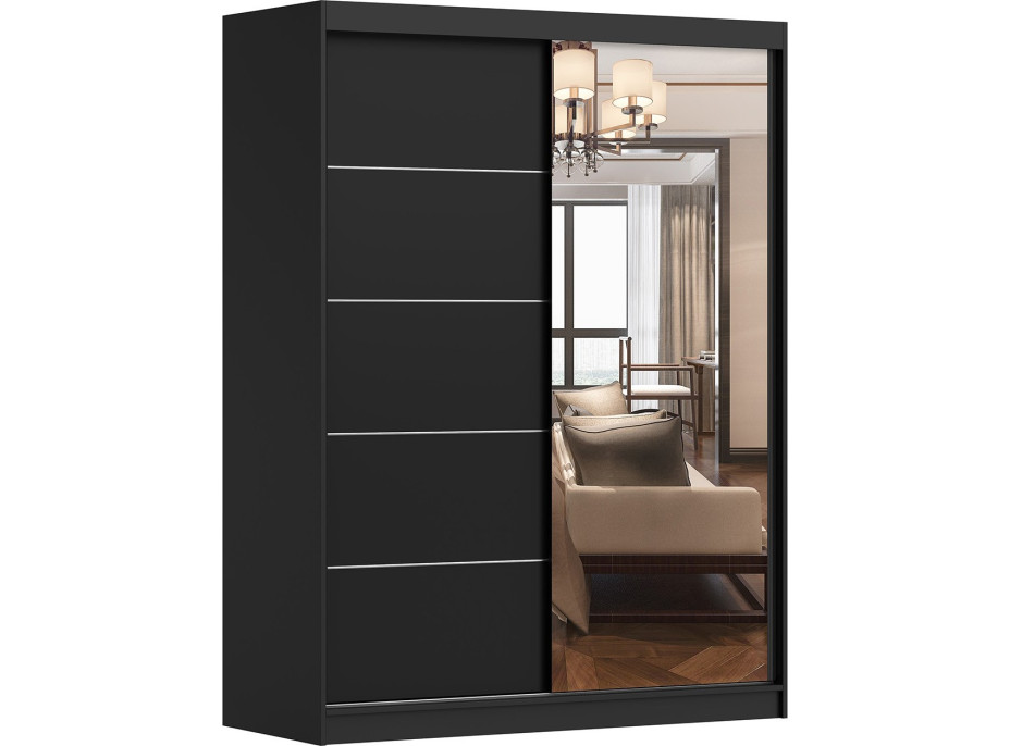 Skriňa je rozdelená na dve časti, ktoré sú vybavené nielen priestrannými policami a závesnou tyčou, ale aj dostatočným priestorom na uloženie veľkého množstva oblečenia, čo z nej robí praktickú voľbu pre každú domácnosť. Na prednej strane je umiestnené zrkadlo, ktoré osvetľuje miestnosť a opticky ju zväčšuje.