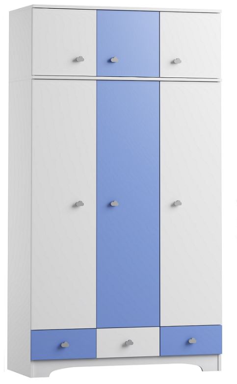 Priestranná šatníková skriňa s nástavcom CLOUDS sa vyznačuje vysokou kvalitou spracovania, ktorú zaisťujú kvalitné lamino dosky o hrúbke 18 mm. Hrany nábytku sú opatrené ABS/PVC materiálom, ktorý ho chráni pred mechanickým poškodením a vlhkosťou. Farbu skrine môžete vyberať z našej bohatej ponuky podľa vašich predstáv. Skriňa je rozdelená do dvoch častí - ľavá strana obsahuje policu a šatníkovú tyč po celej šírke, pravá strana je rozdelená policami. Ďalší úložný priestor poskytujú šuplíky v spodnej časti skrine a nadstavec s policou rozdelený na dve časti. Získate tak veľké množstvo úložných priestorov pre oblečenie a doplnky. Dvierka aj čelá šuplíkov sú osadené plastovými úchytmi v tvare mráčikov, charakteristickými pre celú kolekciu. Úchyty dodávajú nábytku jedinečný charakter a štýl. Šatníková skriňa CLOUDS skvele doplní nábytok z tejto kolekcie a vy tak môžete vytvoriť kombináciu presne podľa potrieb vášho dieťaťa alebo mladého študenta.