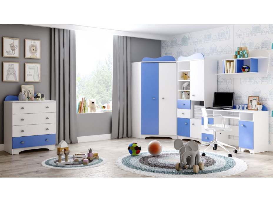 Priestranná šatníková skriňa CLOUDS sa vyznačuje vysokou kvalitou spracovania, ktorú zaisťujú kvalitné lamino dosky o sile 18 mm. Hrany nábytku sú opatrené ABS/PVC materiálom, ktorý ho chráni pred mechanickým poškodením a vlhkosťou. Farbu skrine môžete vyberať z našej širokej ponuky podľa vašich predstáv. Skriňa je rozdelená do dvoch častí - pravá strana obsahuje police a šatníkovú tyč, ľavá strana je rozdelená policami. Ďalší úložný priestor poskytujú šuplíky v ľavej časti skrine. Získate tak veľké množstvo úložných priestorov pre oblečenie a doplnky. Dvierka aj čelá šuplíkov sú osadené plastovými úchytmi v tvare mráčikov, charakteristickými pre celú kolekciu. Úchyty dodávajú nábytku jedinečný charakter a štýl. Šatníková skriňa CLOUDS skvele doplní nábytok z tejto kolekcie a vy tak môžete vytvoriť kombináciu presne podľa potrieb vášho dieťaťa alebo mladého študenta.