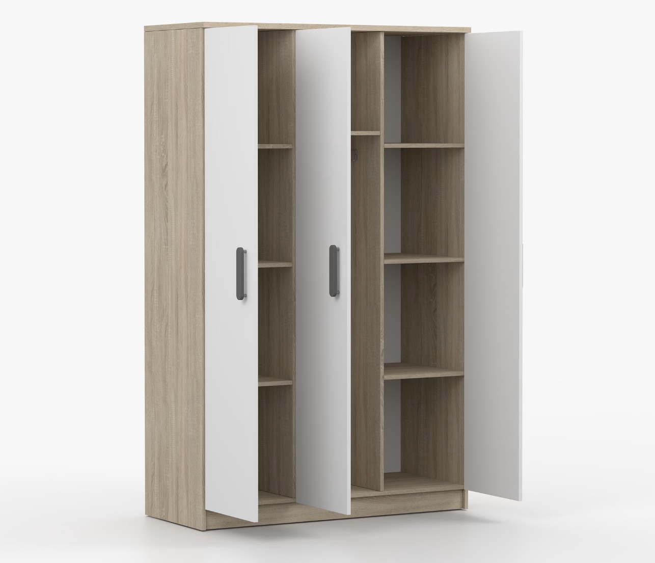 Trojdverová šatníková skriňa SMYK sa vyznačuje praktickým úložným priestorom a veľkou kapacitou. S jednoduchým a moderným dizajnom sa skriňa SMYK hodí do každého typu domácnosti – či už ide o detskú izbu alebo študentov byt. Skriňa je vyrobená z kvalitnej laminovanej dosky s hrúbkou 16 mm s odolnými ABS hranami, ktoré ju chránia pred mechanickým poškodením. Šatníková skriňa poskytuje veľký úložný priestor s dostatočným množstvom políc i miesto na zavesenie oblečenia. Dvere sú opatrené drevenými farebnými úchytkami a otvárajú sa tradičným spôsobom.