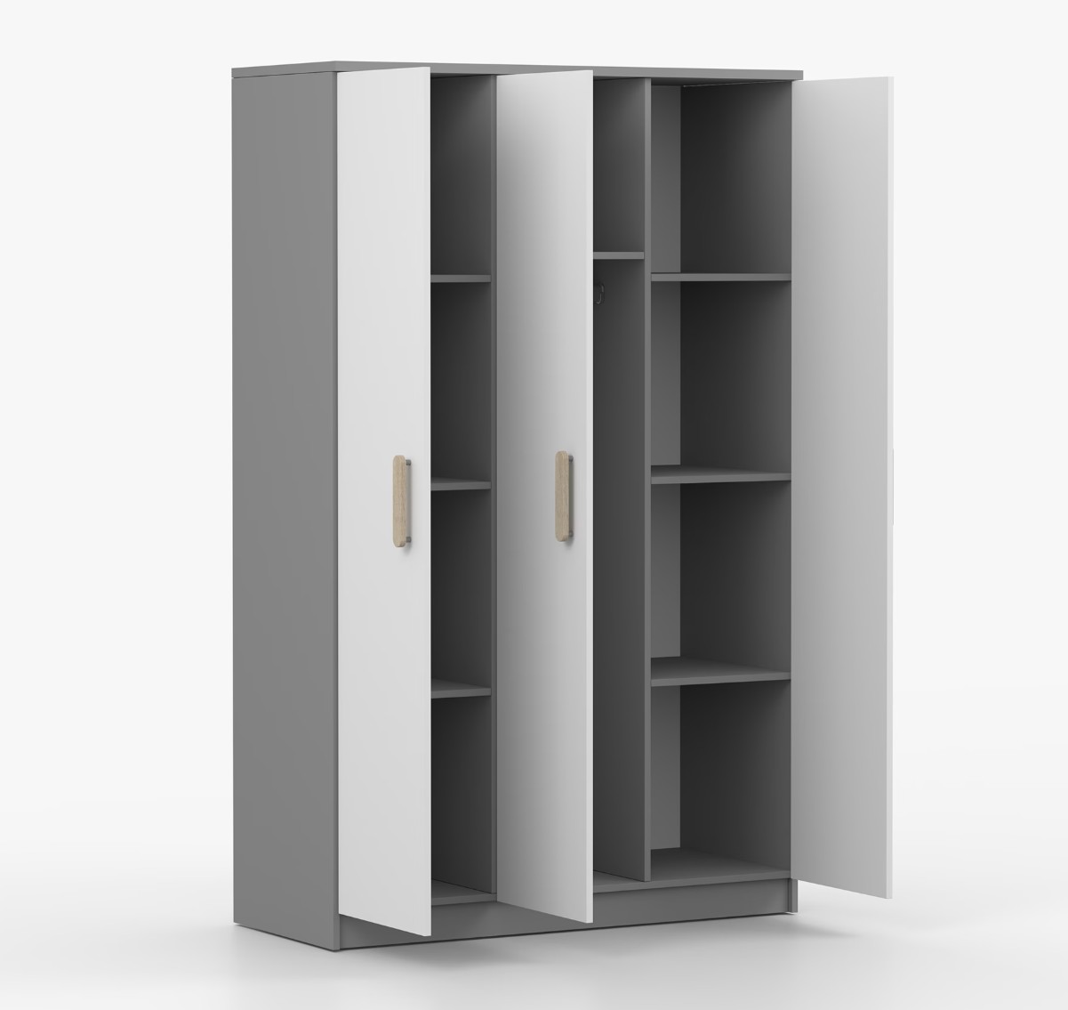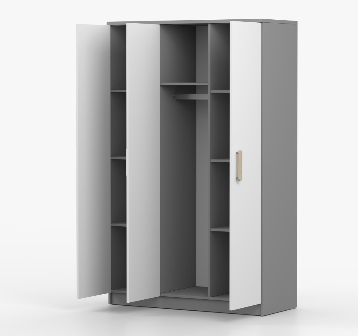 Trojdverová šatníková skriňa SMYK sa vyznačuje praktickým úložným priestorom a veľkou kapacitou. S jednoduchým a moderným dizajnom sa skriňa SMYK hodí do každého typu domácnosti – či už ide o detskú izbu alebo študentov byt. Skriňa je vyrobená z kvalitnej laminovanej dosky s hrúbkou 16 mm s odolnými ABS hranami, ktoré ju chránia pred mechanickým poškodením. Šatníková skriňa poskytuje veľký úložný priestor s dostatočným množstvom políc i miesto na zavesenie oblečenia. Dvere sú opatrené drevenými farebnými úchytkami a otvárajú sa tradičným spôsobom.