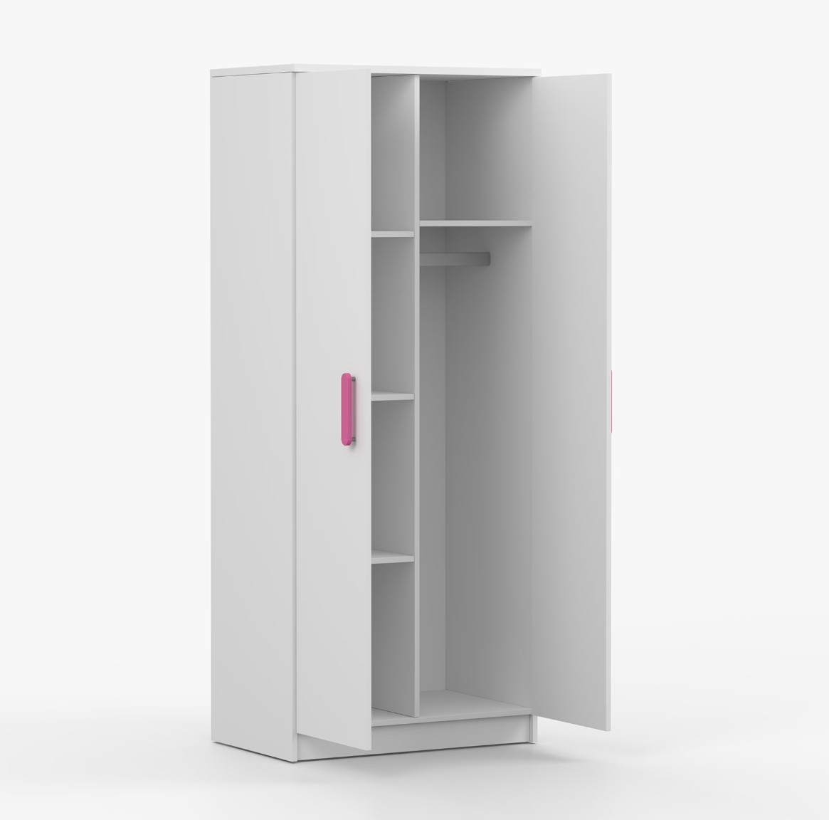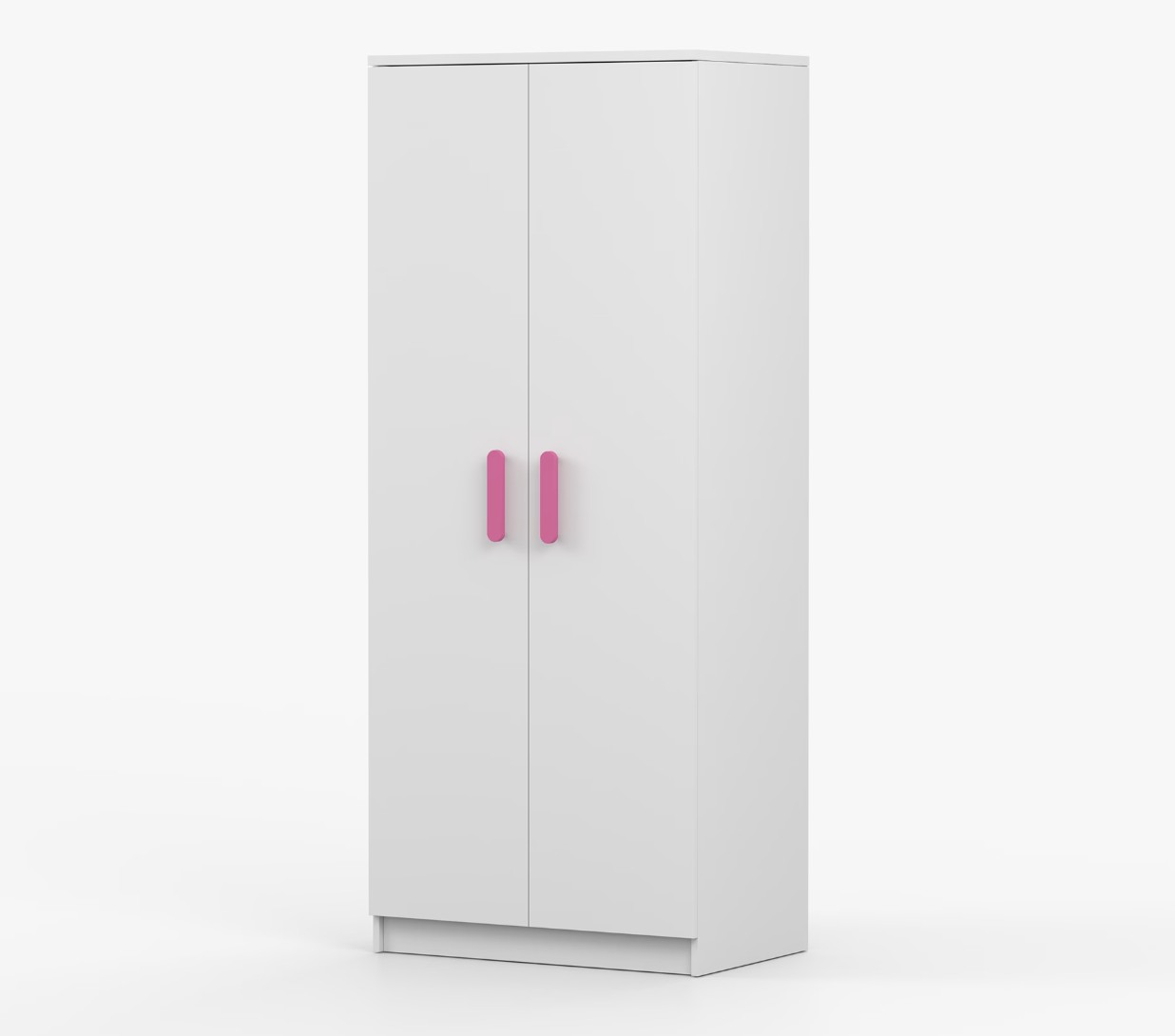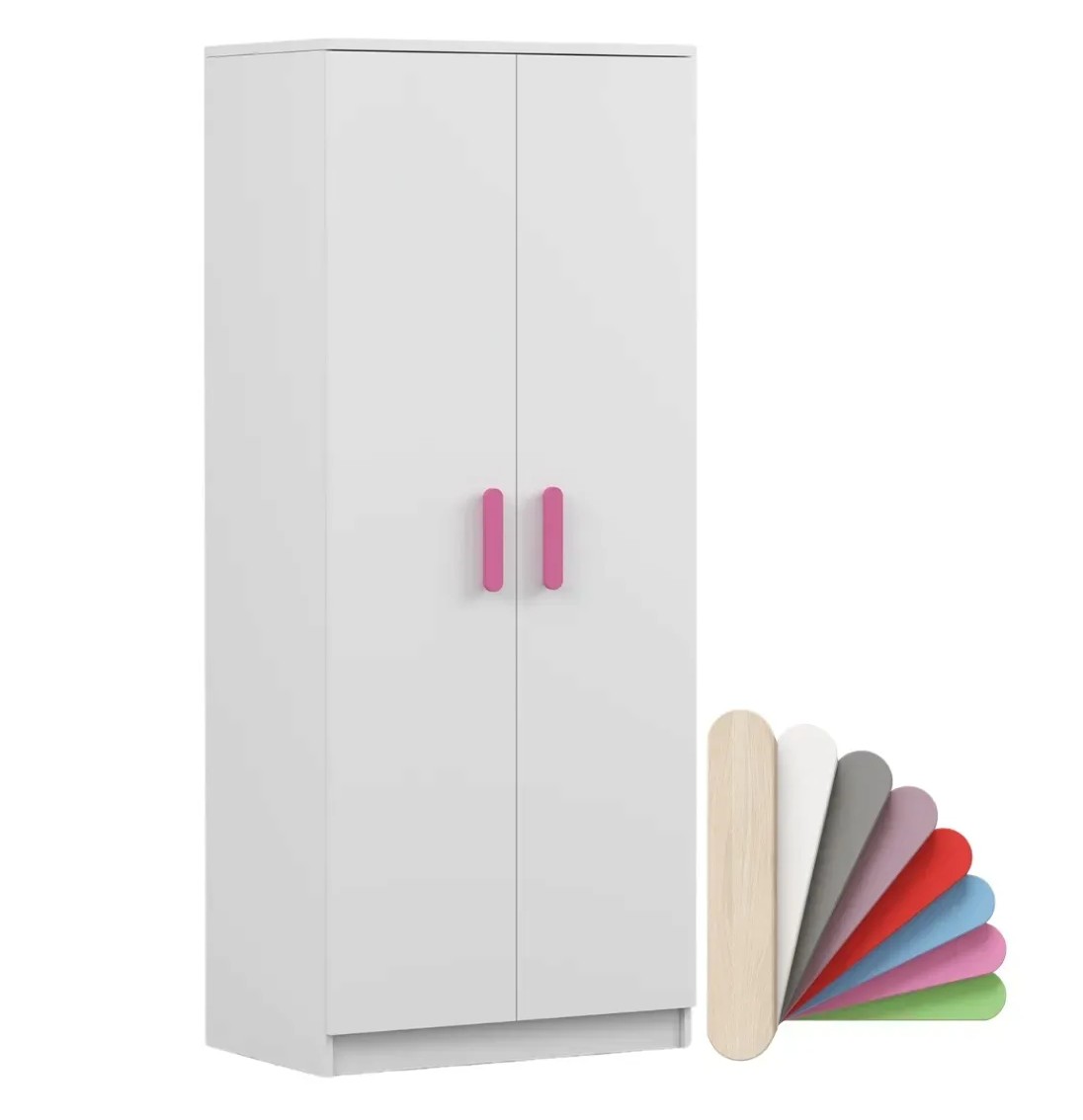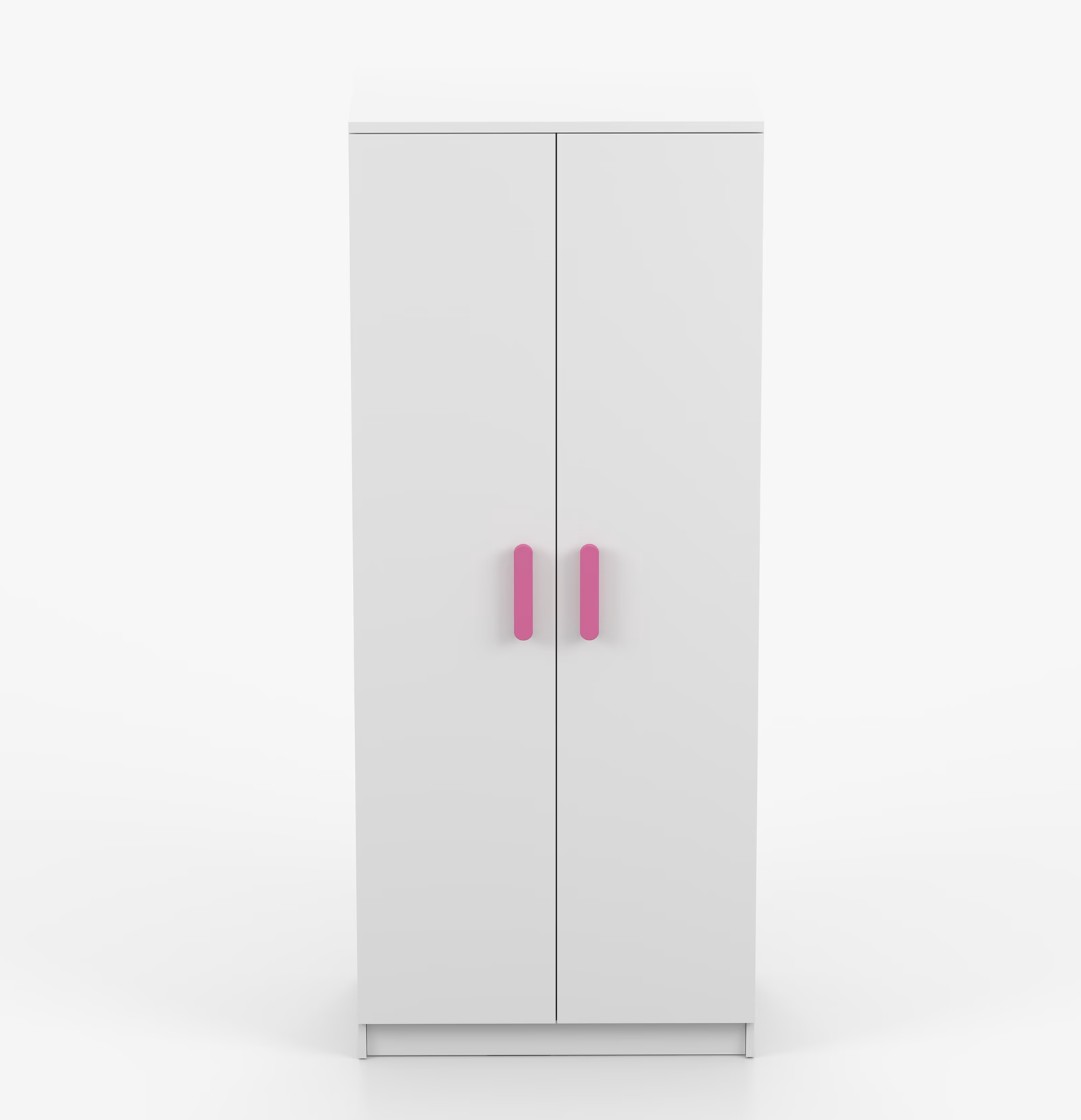 Dvojdverová šatníková skriňa SMYK s jednoduchým a moderným dizajnom sa hodí do každého typu domácnosti - či už ide o detskú izbu alebo študentov byt. Skriňa je vyrobená z kvalitnej laminovanej dosky s hrúbkou 16 mm s odolnými ABS hranami, ktoré ju chránia pred mechanickým poškodením. Šatníková skriňa poskytuje veľký úložný priestor s dostatočným množstvom políc i miesto na zavesenie oblečenia. Dvere sú opatrené drevenými farebnými úchytkami a otvárajú sa tradičným spôsobom.