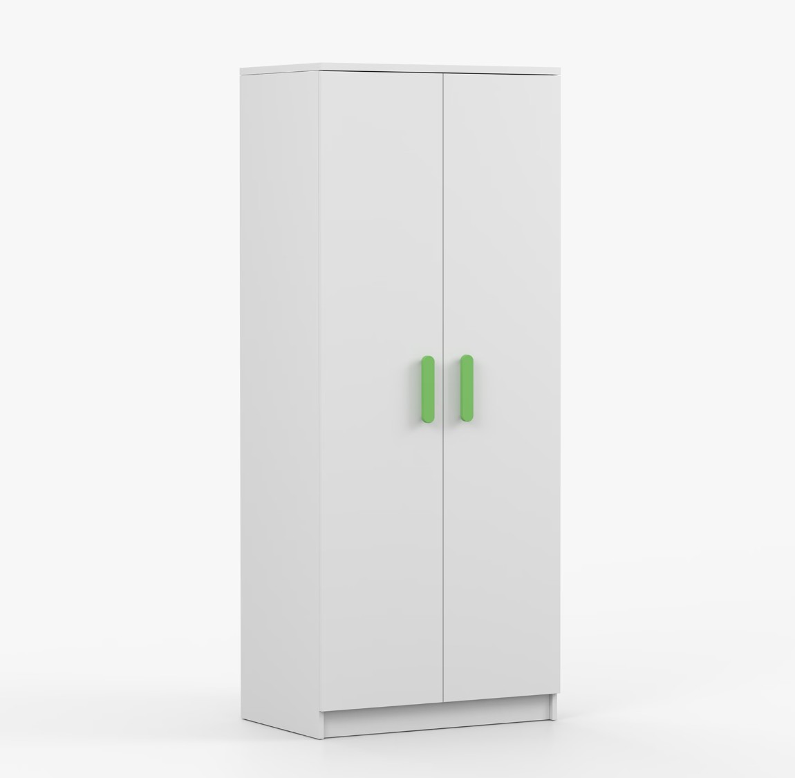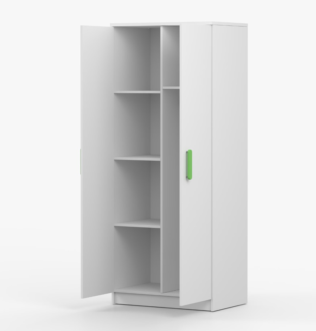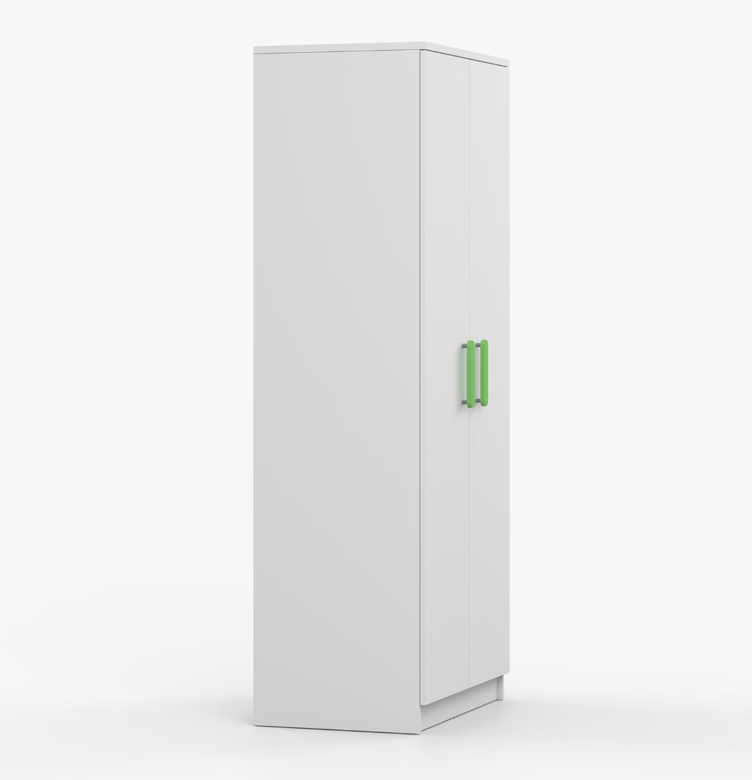 Dvojdverová šatníková skriňa SMYK s jednoduchým a moderným dizajnom sa hodí do každého typu domácnosti - či už ide o detskú izbu alebo študentov byt. Skriňa je vyrobená z kvalitnej laminovanej dosky s hrúbkou 16 mm s odolnými ABS hranami, ktoré ju chránia pred mechanickým poškodením. Šatníková skriňa poskytuje veľký úložný priestor s dostatočným množstvom políc i miesto na zavesenie oblečenia. Dvere sú opatrené drevenými farebnými úchytkami a otvárajú sa tradičným spôsobom.