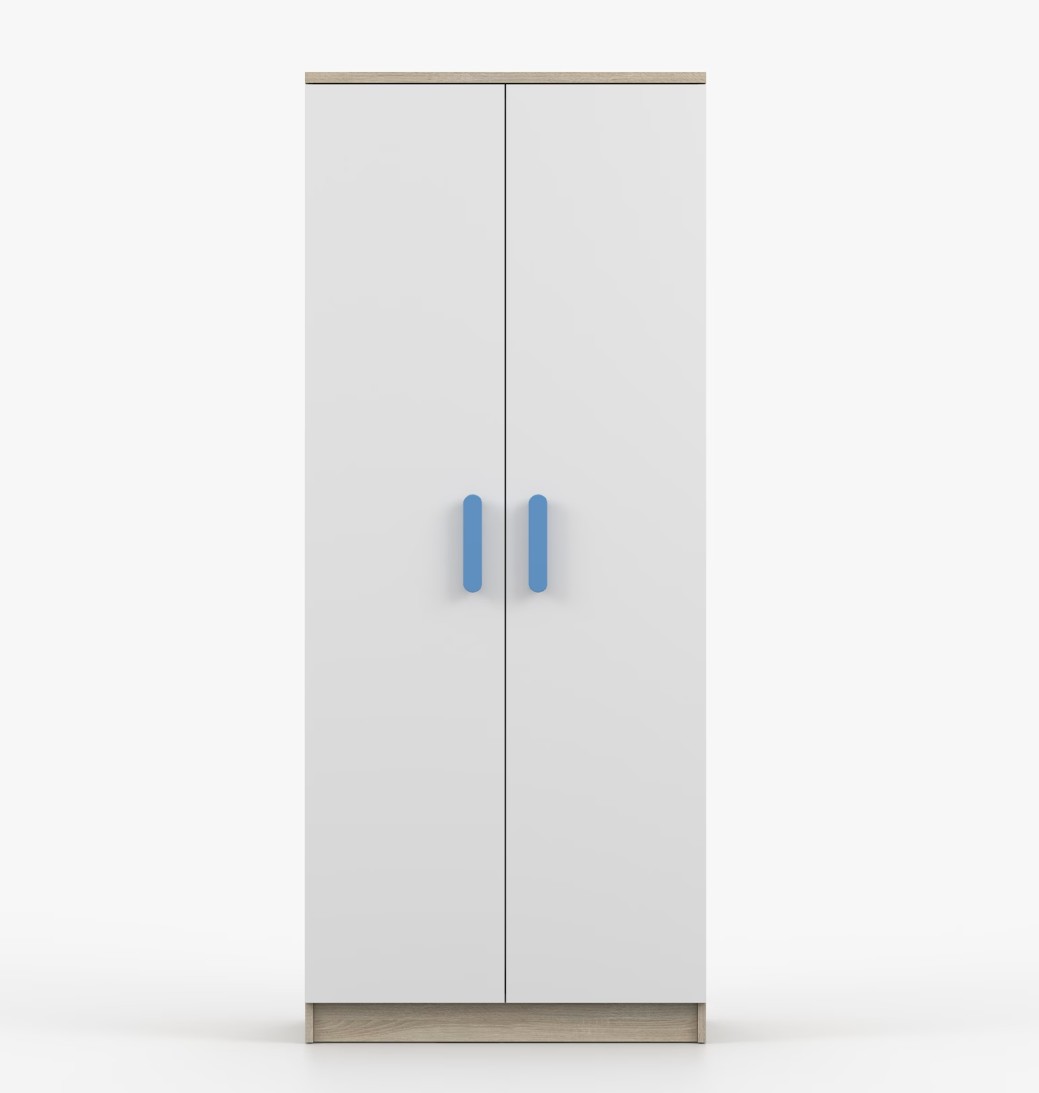 Dvojdverová šatníková skriňa SMYK s jednoduchým a moderným dizajnom sa hodí do každého typu domácnosti - či už ide o detskú izbu alebo študentov byt. Skriňa je vyrobená z kvalitnej laminovanej dosky s hrúbkou 16 mm s odolnými ABS hranami, ktoré ju chránia pred mechanickým poškodením. Šatníková skriňa poskytuje veľký úložný priestor s dostatočným množstvom políc i miesto na zavesenie oblečenia. Dvere sú opatrené drevenými farebnými úchytkami a otvárajú sa tradičným spôsobom.