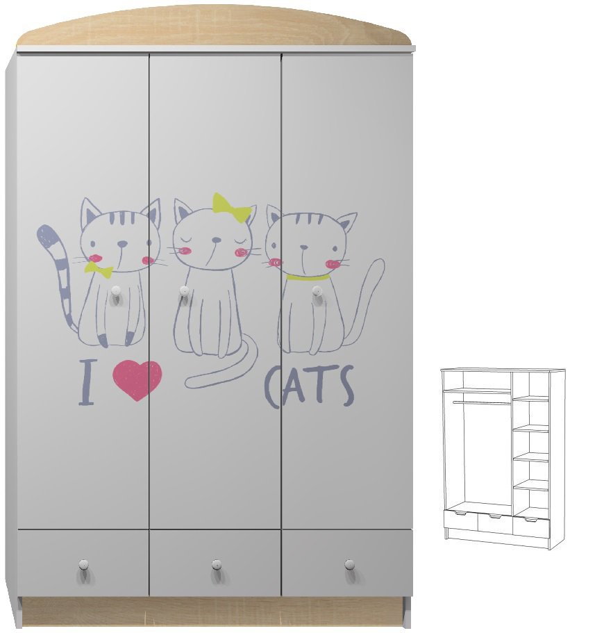 Táto šatníková skriňa je v skutočnosti all-in-one. Nájdete v nej všetky úložné priestory. Hneď v spodnej časti skrine nájdete tri šuplíky. Vrchná časť skrine je rozdelená do dvoch častí. V pravej samostatnej časti je päť políc. V ľavej časti je hore dlhá police a vo zvyšku veľký priestor sa šatníková tyčí.
