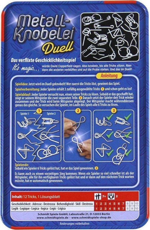 Dvanásť malých kovových hlavolamov SCHMIDT Metall-Knobelei Duell v plechovej krabičke. Každý hlavolam je zložený z dvoch častí. Úlohou je najskôr nájsť spôsob, ako tieto dve časti bez použitia sily od seba úplne oddeliť a následne ich zase spojiť k sebe do východiskovej pozície. - 12 hlavolamov z kovu - princíp rozlož a opäť zlož do pôvodného tvaru - graficky znázornené riešenie súčasťou balenia Hra pre dvoch hráčov - duel: Každý hráč dostane náhodné 3 hlavolamy. Akonáhle niektorý z hráčov hlavolam vyrieši, ukáže protihráčovi obe oddelené časti a opäť hlavolam zloží. Víťazom sa stáva hráč, ktorý najskôr vyrieši všetkých 6 hlavolamov. Pokiaľ má niektorý z hráčov vyriešené všetky dostupné hlavolamy a musí čakať na posledný, potom automaticky vyhráva. Odporúčané od 7 rokov.Vlastnosti