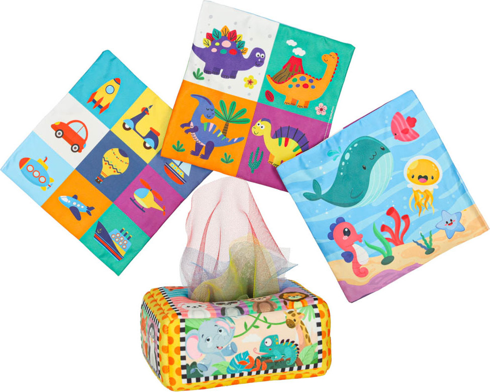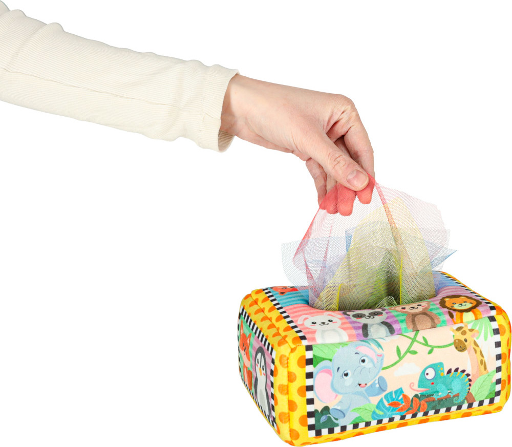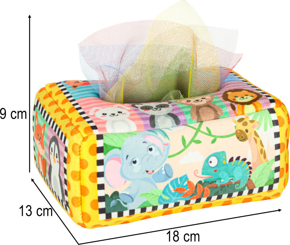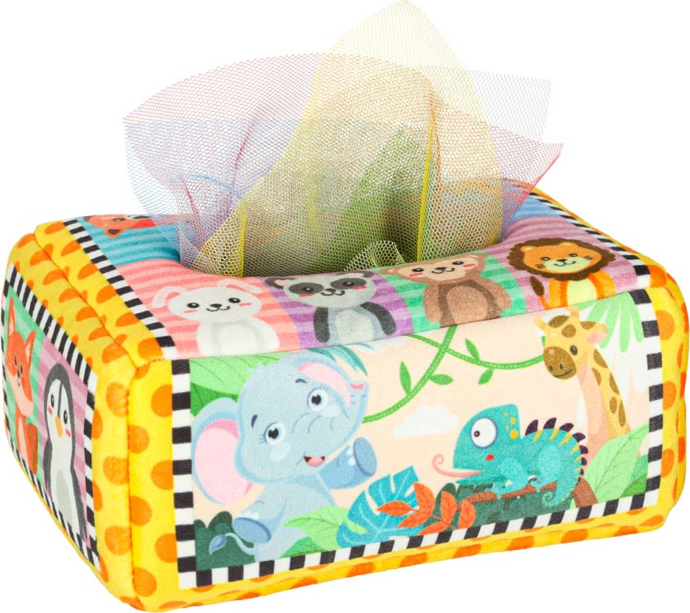 - Senzorická stimulácia: Sada obsahuje 8 priehľadných farebných vreckoviek a 3 látky s rôznymi vzormi, ktoré stimulujú zrak a hmat dieťaťa a rozvíjajú jeho zmyslové vnímanie. Steny plyšovej krabice aj tri vzorované vreckovky boli opatrené šuštivou senzorickou fóliou, ktorá pri rozdrvení vydáva jemný zvuk. Tento dodatočný zvukový prvok podnecuje zvedavosť dieťaťa a podporuje rozvoj sluchového vnímania.