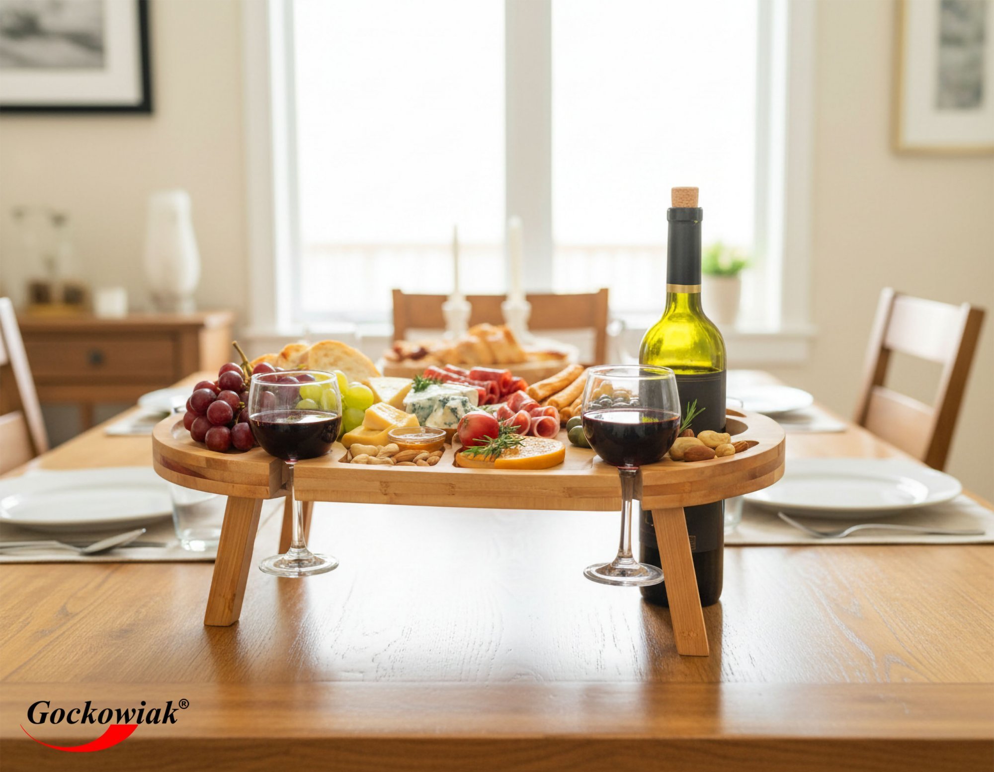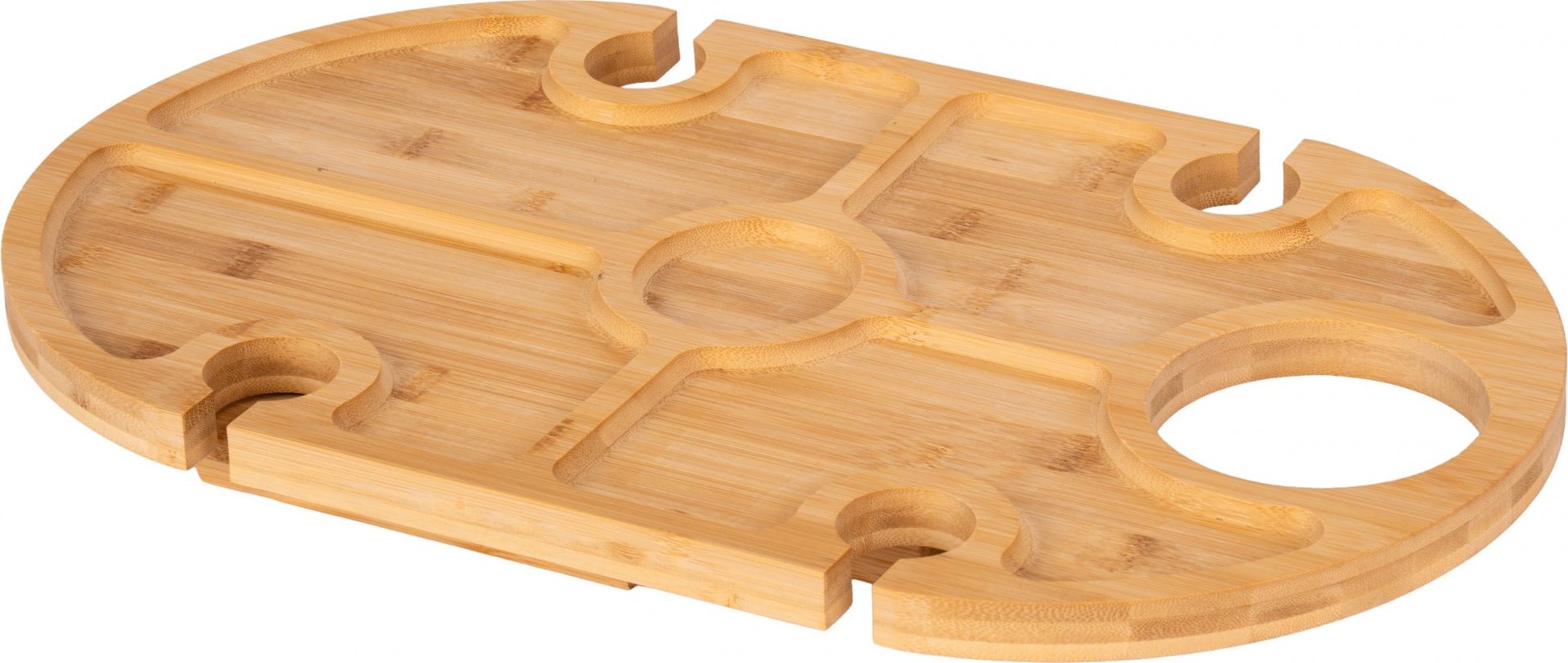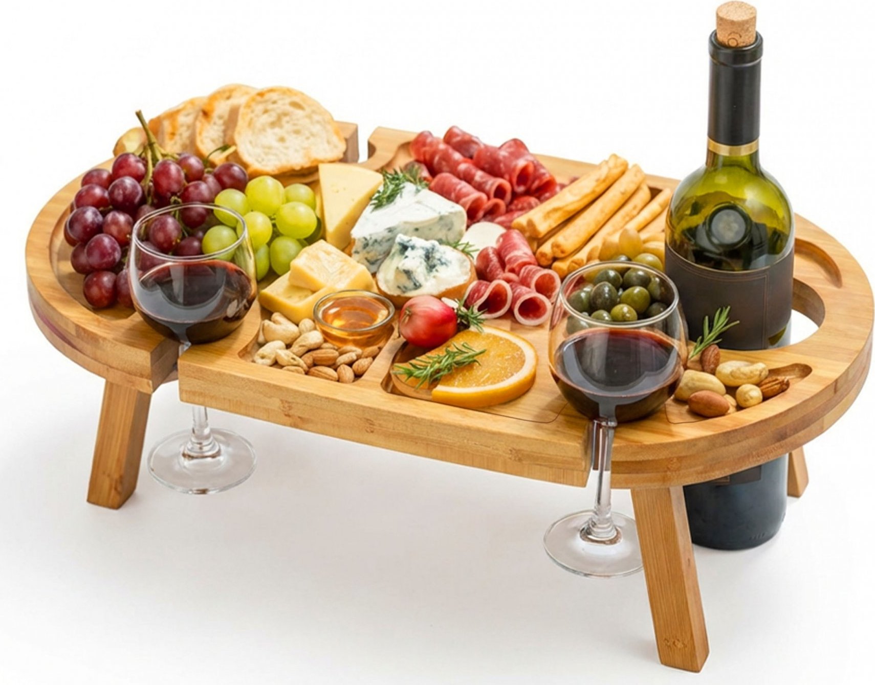 Syrová doštička Delia kombinuje štýl a funkčnosť, je ideálna pre stretnutie s priateľmi, večery s vínom a rodinné oslavy. Je vyrobené z odolného bambusu, pýši sa prirodzeným vzhľadom a zároveň zaisťuje pohodlie a dlhú životnosť. Jeho skladací dizajn a stabilné nohy dodávajú doske na stole pôsobivý vzhľad av zloženom stave zaberá minimum miesta. Premyslené usporiadanie umožňuje elegantné servírovanie syrov, údenín, ovocia a rôznych občerstvení. Ďalší priestor pre fľašu vína a špeciálne výrezy pre štyri poháre vytvárajú harmonický celok, ktorý zdôrazňuje jedinečný charakter každej príležitosti.