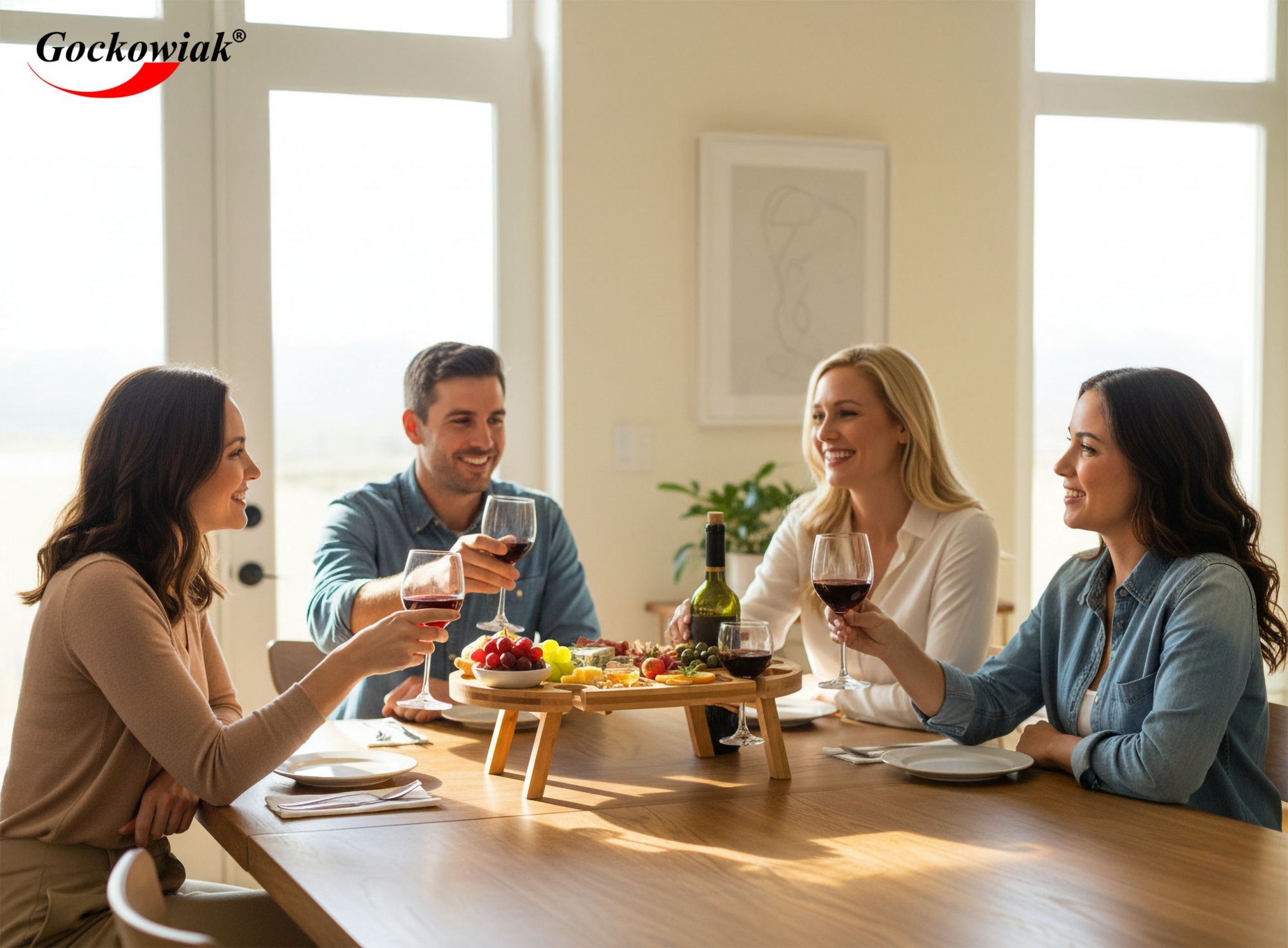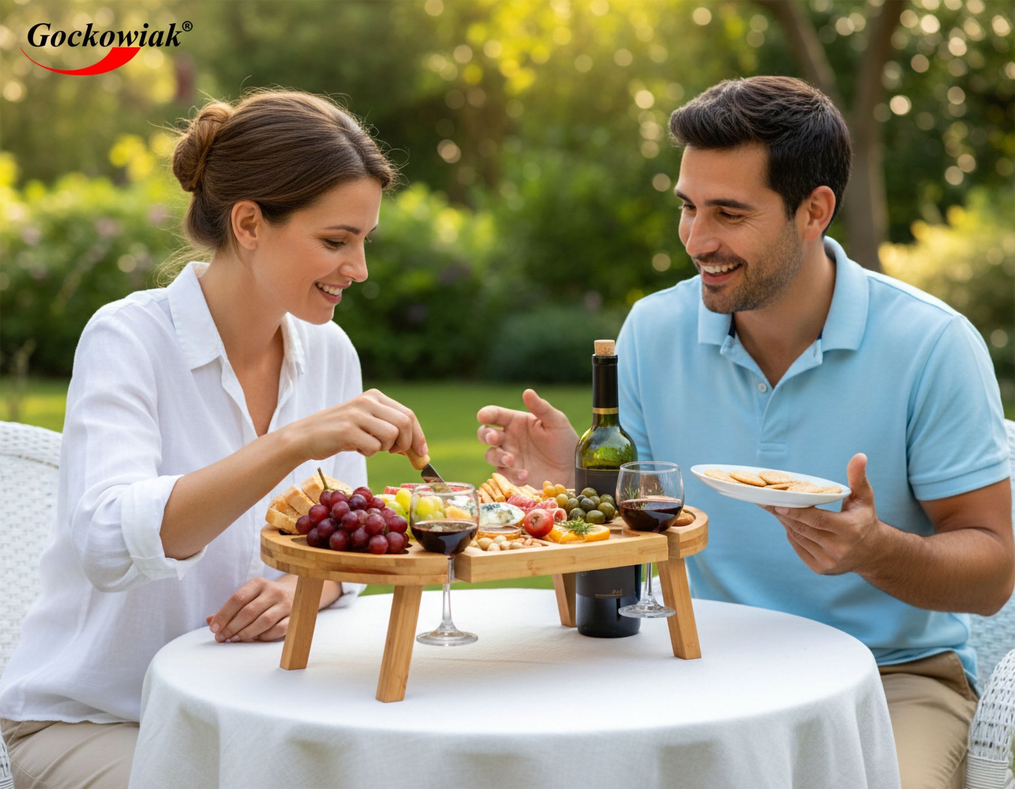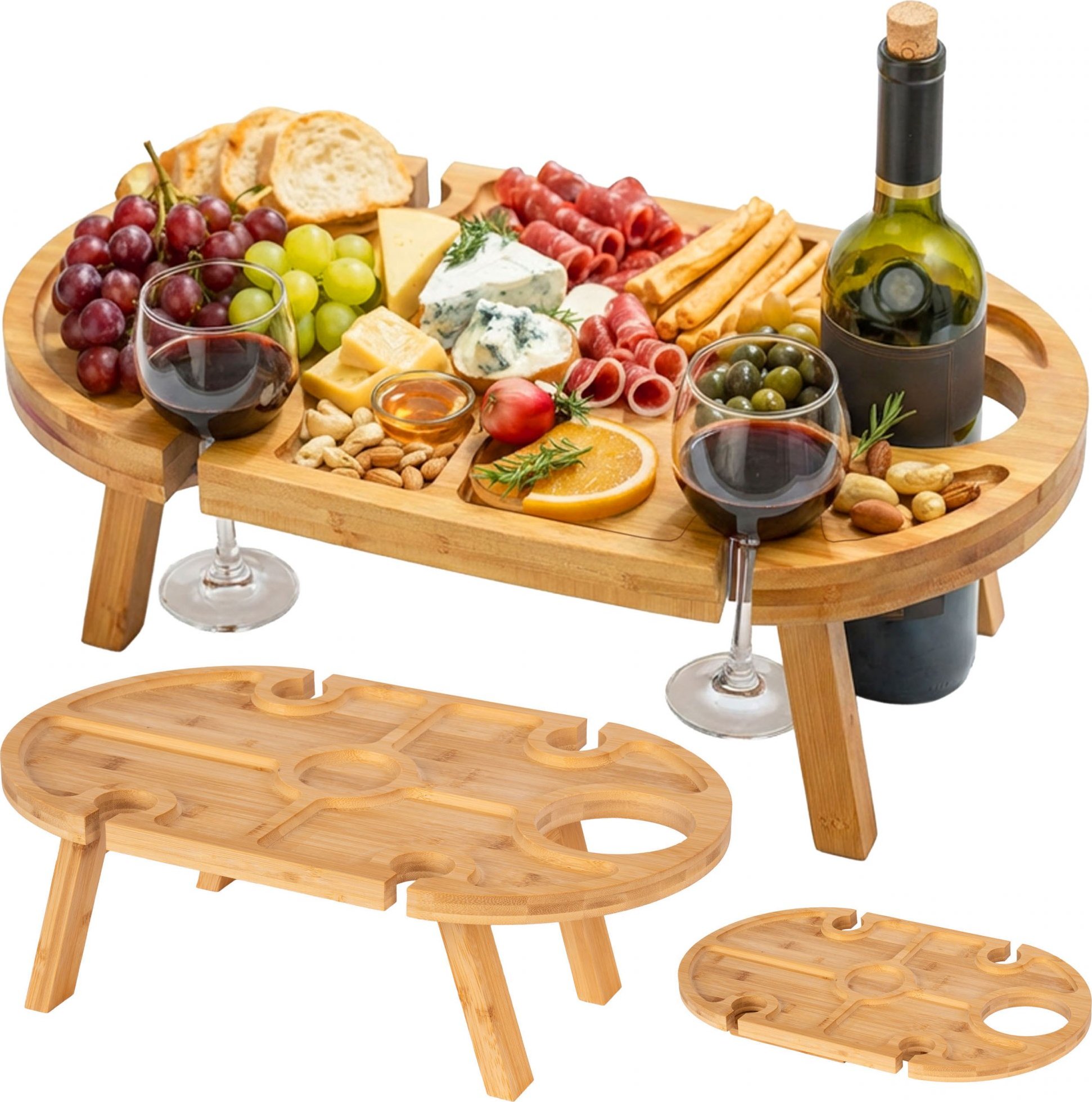 Syrová doštička Delia kombinuje štýl a funkčnosť, je ideálna pre stretnutie s priateľmi, večery s vínom a rodinné oslavy. Je vyrobené z odolného bambusu, pýši sa prirodzeným vzhľadom a zároveň zaisťuje pohodlie a dlhú životnosť. Jeho skladací dizajn a stabilné nohy dodávajú doske na stole pôsobivý vzhľad av zloženom stave zaberá minimum miesta. Premyslené usporiadanie umožňuje elegantné servírovanie syrov, údenín, ovocia a rôznych občerstvení. Ďalší priestor pre fľašu vína a špeciálne výrezy pre štyri poháre vytvárajú harmonický celok, ktorý zdôrazňuje jedinečný charakter každej príležitosti.