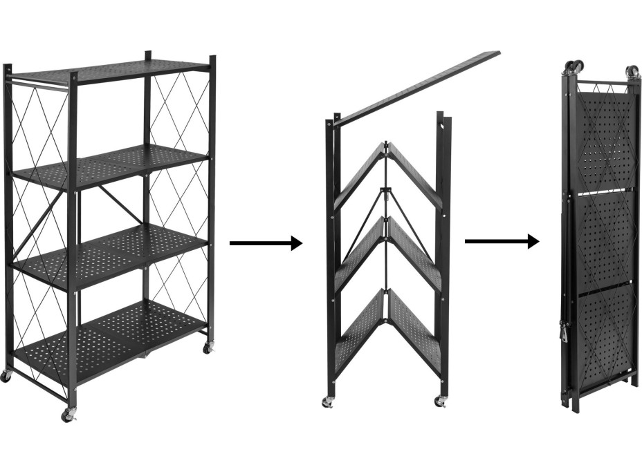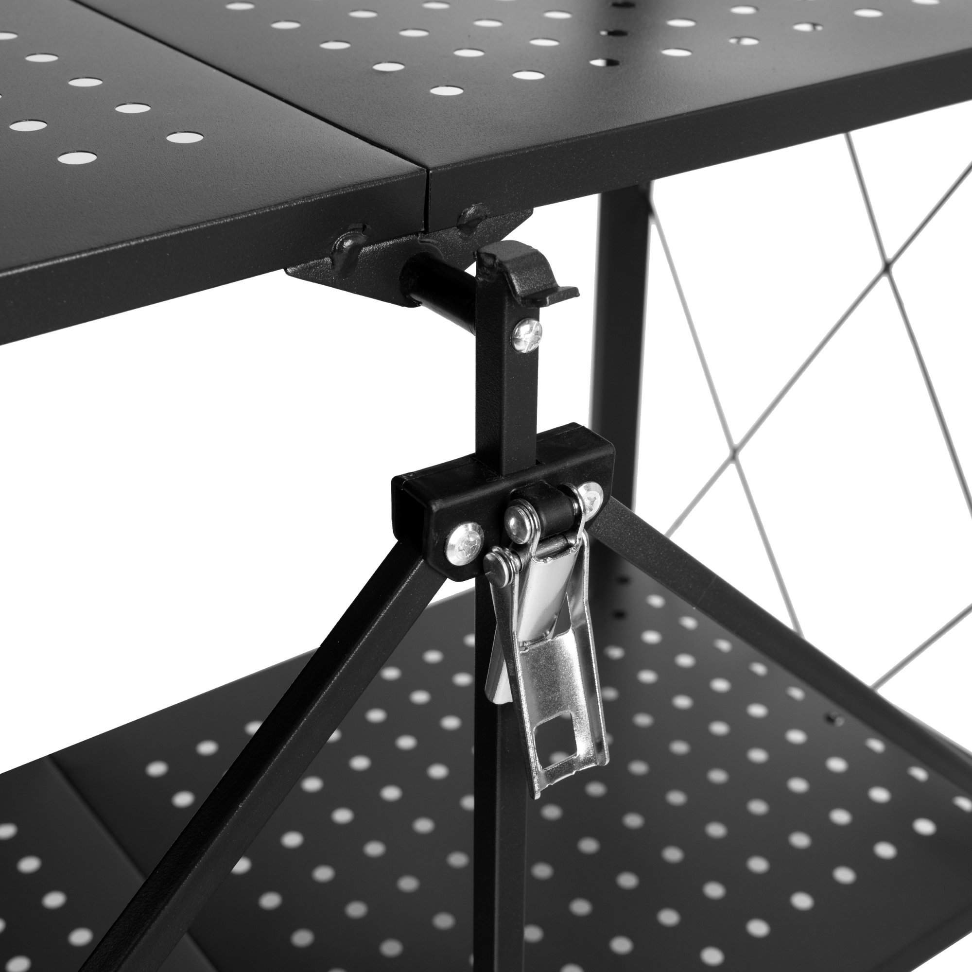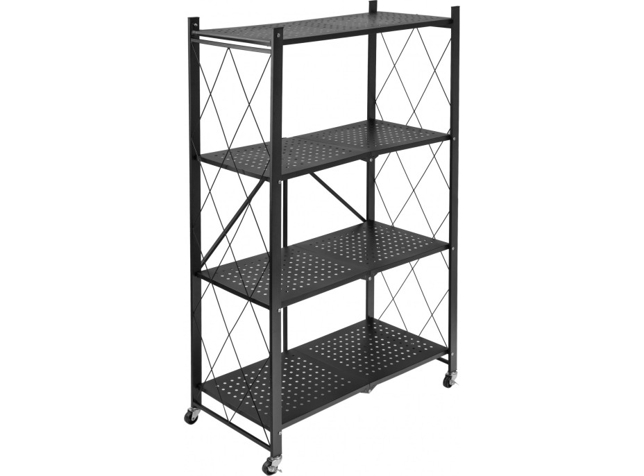 Skladací regál Gestel je perfektným riešením pre každého, kto oceňuje funkčnosť a mobilitu. Vďaka štyrom priestranným policiam, pevnej oceľovej konštrukcii a pojazdným kolieskam sa regál skvele hodí ako do domácnosti, tak do kancelárie. Jeho univerzálna čierna farba zapadne do každého interiéru a možnosť rýchleho zloženia uľahčuje skladovanie.