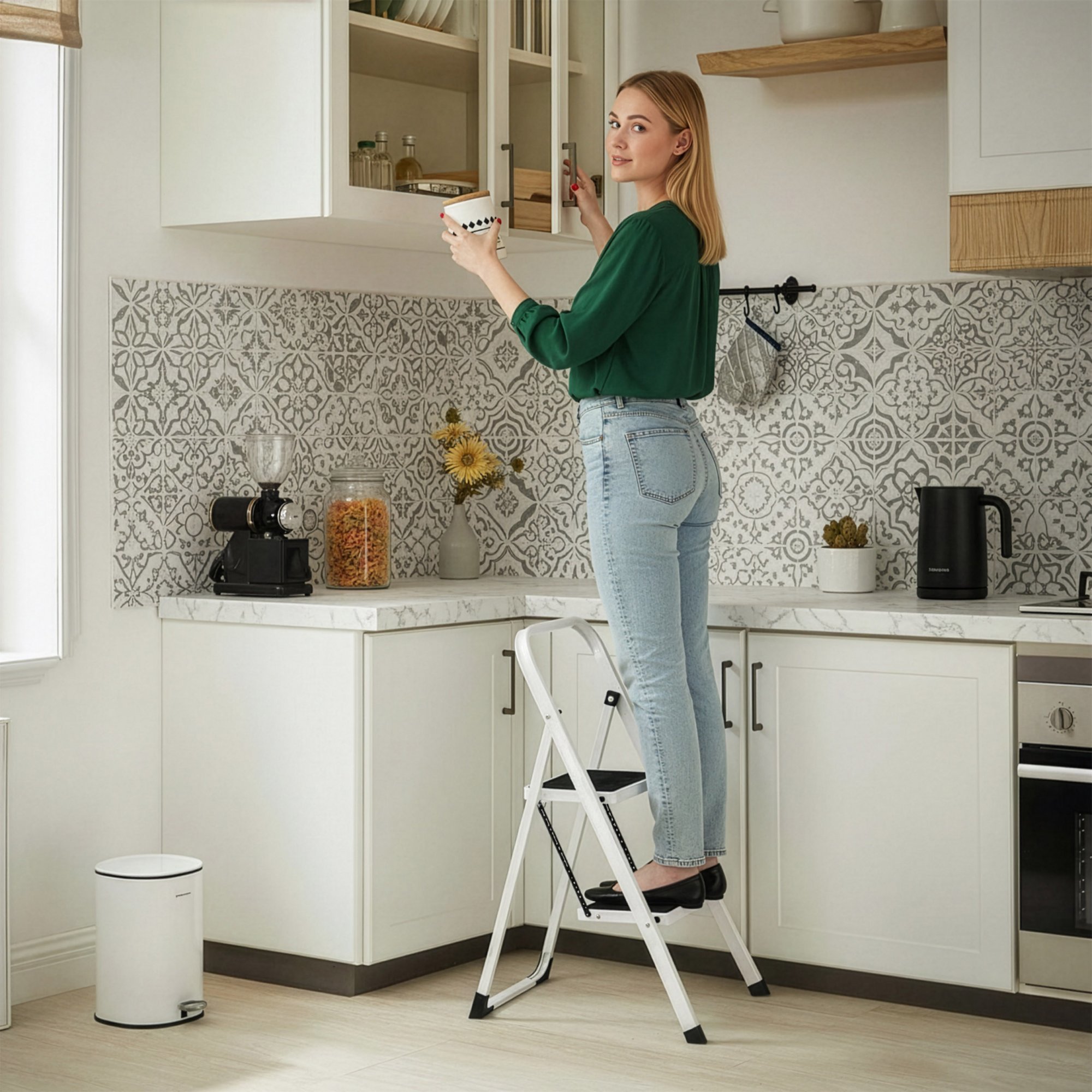 Dvojstupňový rebrík Stige ponúka pohodlnú a funkčnú oporu pre každodenné úlohy v domácnosti, keď potrebujete bezpečnú a vyvýšenú polohu bez nutnosti veľkého rebríka. Umožňuje vám ľahko dosiahnuť na vyššie police, skrinky alebo okná, čo šetrí čas a energiu. Jeho pevná a stabilná konštrukcia, protišmykové komponenty a kompaktné rozmery zaisťujú pohodlie a pocit bezpečia a po dokončení je možné rebrík ľahko zložiť a uskladniť, a to aj v malom priestore.