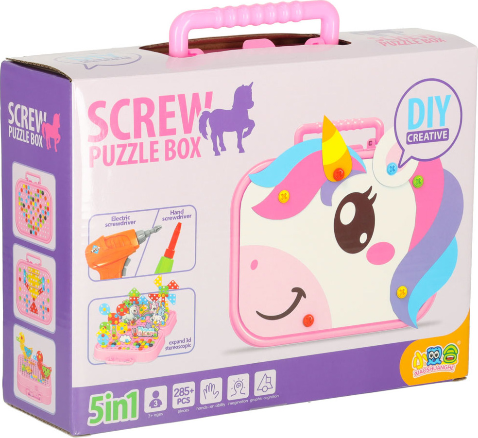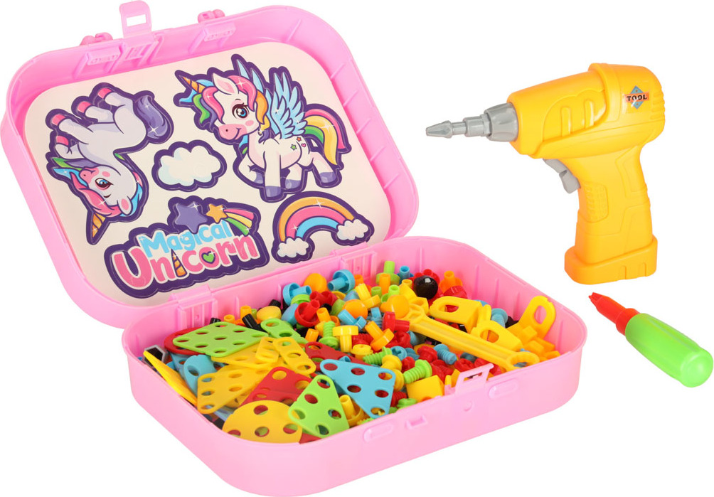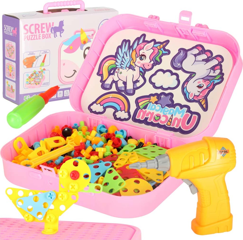 Farebné stavebnice sú perfektnou voľbou pre každé dieťa - poskytnú hodiny zábavy a zároveň rozvíjajú kľúčové zručnosti. Celá sada je dodávaná v praktickom plastovom puzdre, ktoré slúžia na dva účely: slúži ako pohodlné miesto na uloženie kociek a ako kreatívne „plátno“ pre mladého staviteľa. Otvory v puzdre umožňujú vkladanie farebných kociek a skrutiek pomocou skrutkovača alebo vŕtačky (batérie nie je súčasťou balenia). Kartónové dosky s jednorožcami navyše dodávajú každému projektu jedinečný nádych. Po hraní sa doska premení na praktické prepravné puzdro, ktoré je ideálne na uloženie všetkých súčastí sady. Hranie s kockami je vynikajúca pre rozvoj presnosti prstov a koordinácie ruka-oko, rovnako ako logického a kreatívneho myslenia.