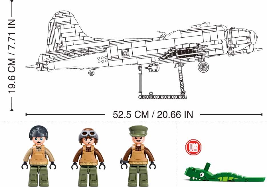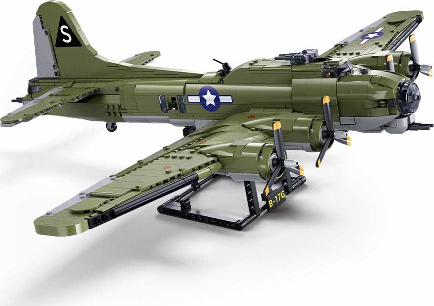 Stavebnica Sluban model Bricks B-17G Flying Fortress predstavuje detailný model legendárneho amerického ťažkého bombardéra Boeing B-17G Flying Fortress, ktorý bol jedným z najznámejších a najpoužívanejších lietadiel druhej svetovej vojny. Tento štvormotorový bombardér, prezývaný „Lietajúci pevnosť“, slúžil v americkom armádnom letectve (USAAF) a preslávil so svojou odolnosťou, uniesol až 8 ton bômb, dosahoval rýchlosť cez 460 km/ha jeho posádku tvorilo desať členov. Model v mierke 1:44 je zostav odolného ABS plastu, ktorý zaručuje stabilnú a trvanlivú konštrukciu. Stavebnica verne zachytáva skutočný tvar lietadla, vrátane detailne spracovaného trupu, krídiel, chvostovej časti, motorov, priehľadného kokpitu a charakteristického olivovo zeleného sfarbenia s americkým leteckým označením. Model ponúka funkčné prvky, ako je výsuvný a zaťahovací podvozok, otočné vrtule a pohyblivé časti krídiel a smerovky, ktoré umožňujú nastaviť lietadlo do letovej alebo pristávacej polohy. Súčasťou balenia je aj vystavovací stojan s označením typu B-17G, vďaka ktorému je možné model elegantne prezentovať. Stavebnica obsahuje tri minifigúrky členov posádky a drobné doplnky, ktoré dopĺňajú realistický vzhľad a herné možnosti. Po zostavení dosahuje model dĺžku približne 52 cm, čo zodpovedá realistickým proporciám originálu v uvedenom meradle. Rovnako ako ostatné modely radu Sluban Model Bricks je aj táto stavebnica plne kompatibilná so stavebnicami ďalších výrobcov, vrátane LEGO®, čo umožňuje rozšírenie modelu alebo kombináciu dielikov s inými sadami. Stavebnica podporuje rozvoj jemnej motoriky, priestorovej predstavivosti, trpezlivosti, kreativity a zmyslu pre detail, a zároveň približuje významný kus histórie letectva.