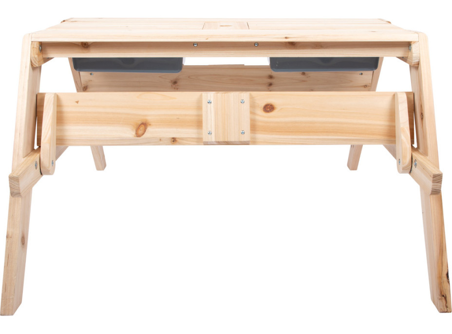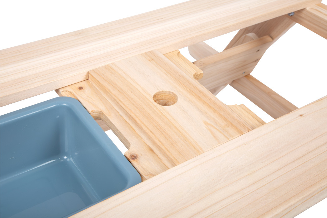Baví Vás vyrábať bahno a iné zmesi z prírodných materiálov? Tento stôl z masívneho dreva odolného voči poveternostným vplyvom upúta nielen pozornosť na záhrade, terase alebo balkóne, ale predovšetkým ponúka deťom možnosť dlhej hodiny kreatívnej hry na čerstvom vzduchu. Vrchol sa skrýva vo vnútri detského stolíka. Akonáhle sa zdvihnú dve stolové dosky, vznikne úžasné miesto na hranie s pieskom, vodou alebo blatom. Dve odnímateľné vaničky z robustného plastu s objemom 3 litre každá, sú ideálne nielen na miešanie rôznych materiálov, ale aj na uskladnenie hračiek na piesok, uskladnenie piesku, zber prírodných materiálov alebo naplnenie vodou. Lavice sa dajú sklopiť.