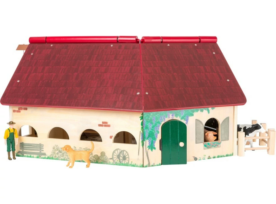Život na farme je taký skvelý! Tento veľký statok zo 100% certifikovaného dreva FSC® pre malých farmárov má všetko, čo by si mohli priať. Zvláštne kúzlo - stabilná drevená konštrukcia farmy je usporiadaná do nápadného uhlového tvaru a je vybavená sklopnou strechou, vďaka ktorej je hranie veľmi pohodlné. Zvieratá sú priateľské k deťom, rozžiaria ich. Strakatá krava a ružové prasa majú svoje miestečko v dvoch boxoch v stajni, ktoré sú vybavené posuvnými dverami. Farmársky pes má oči otvorené a pomáha farmárovi udržať všetko v chode. Farmár pohyblivou kladkou stále pridáva nové balíky sena a slamy. O všetky zvieratá je dobre postarané. Podrobný dizajn farmy podporuje realistickú hru – fantázii sa medze nekladú. Delené dvere farmy ponúkajú toľko priestoru, že traktor môže ľahko prejsť a zaparkovať. Pre malých objaviteľov je okolo nádvoria mnoho jemne maľovaných detailov, ako sú kvety, lavička, kanva, vtáčie hniezdo a dokonca aj myš. Skoro ako na skutočnej farme!