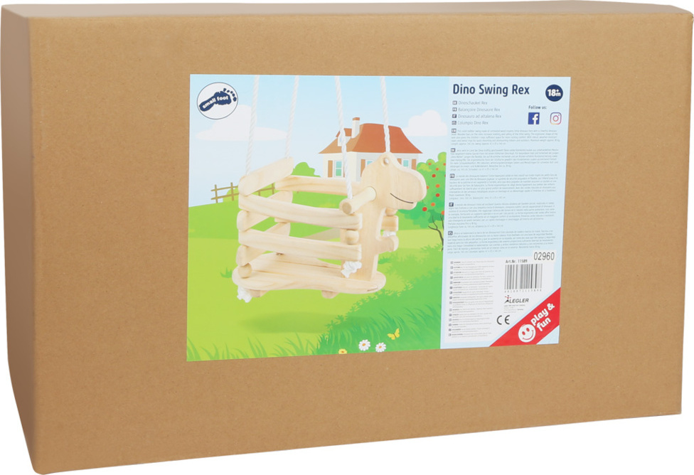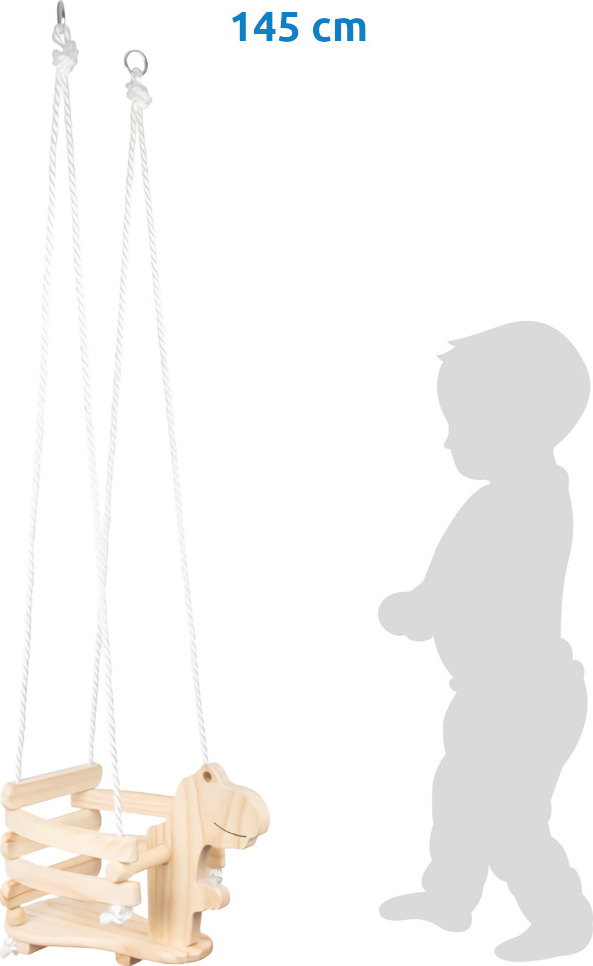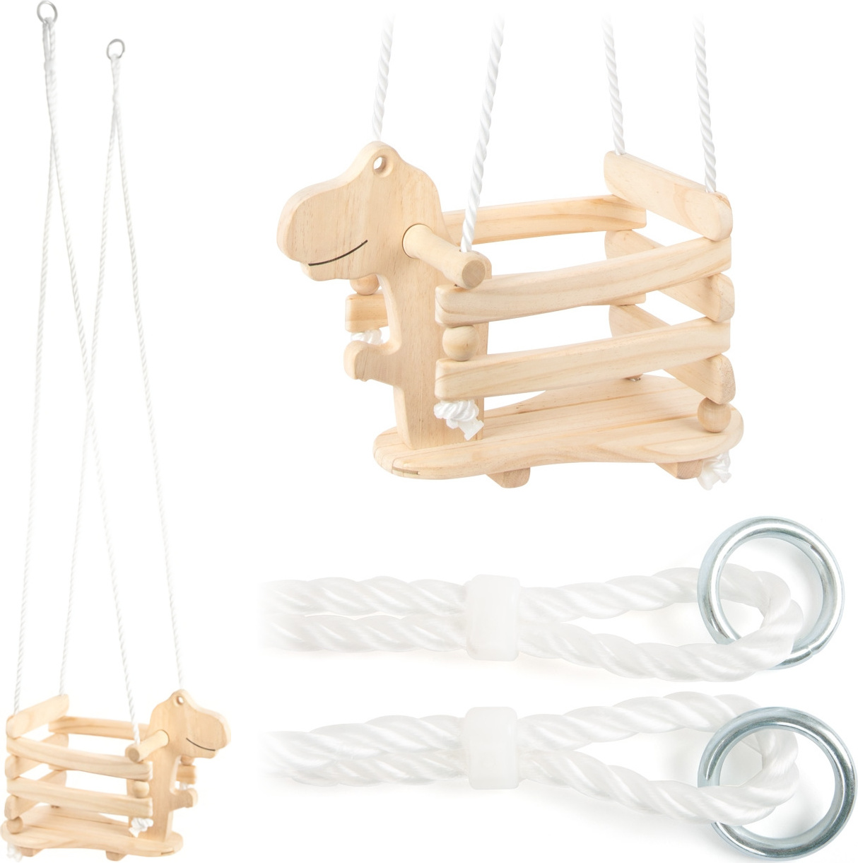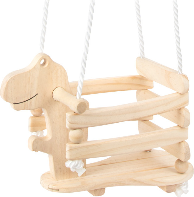 Táto hojdačka pre batoľatá z neošetreného masívneho dreva poteší malých fanúšikov dinosaurov. Flexibilné zabezpečenie dieťaťa zo všetkých strán, ktoré siaha až do výšky hrudníka, rovnako ako dve rukoväte, zaisťujú mladým „dinosaurovým jazdcom“ veľkú podporu, istotu a bezpečnosť. Ergonomický tvar sedadla tiež dáva detským nohám dostatočnú voľnosť pre väčšie hojdacie pohodlie. S robustnými lanami odolnými proti poveternostným vplyvom a kovovými krúžkami na rýchle zavesenie, možno použiť ako vonku, tak aj vo vnútri.