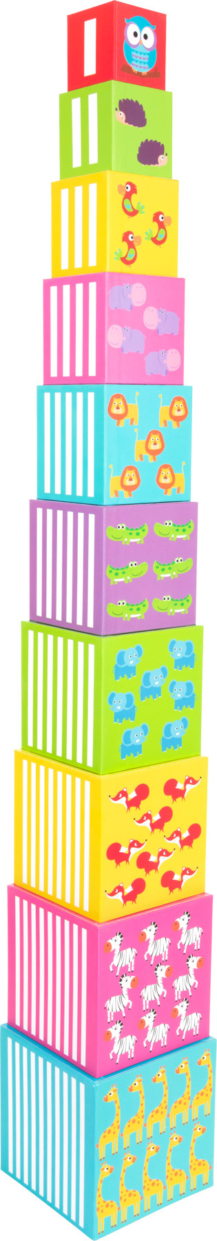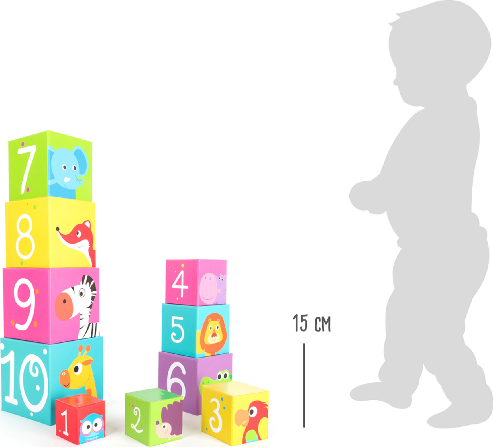 Ako vysoko dokážete skladať? Tieto veselé zvieratká pozývajú všetkých malých staviteľov na skladanie. Desať ľahkých a stabilných kociek je vyrobených z lepenky. Majú farebnú potlač so zvieratkami a číslami. Deti si s nimi precvičia motoriku a sústredenosť. Kocky môžete uložiť do seba, nezaberú tak veľa miesta. Deti si precvičia rozpoznávanie zvierat aj čísel.