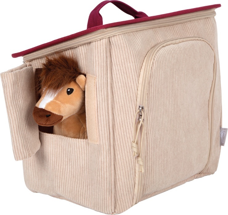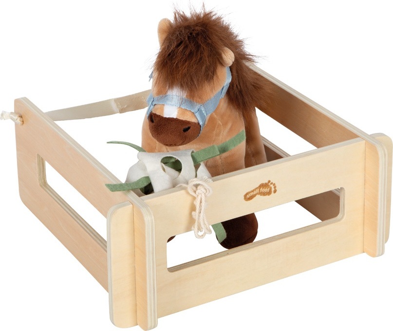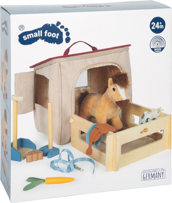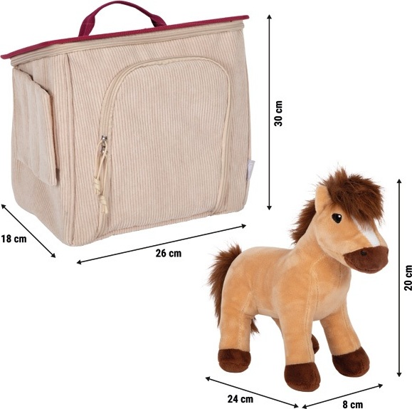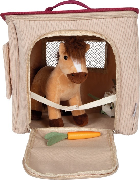 Nasadať a hráme sa! Tento nádherne spracovaný set s témou koní a jazdenia má všetko, čo malí milovníci koní potrebujú ku šťastiu! Hlavnú rolu hrá roztomilý plyšový koník, ktorý býva v pevnej menčestrovej taške. A teraz pozor! Vďaka zipsom sa taška behom chvíľky premení na stajne a zároveň slúži ako praktické úložisko pre všetko príslušenstvo! Ohrádku s pripevnením na suchý zips môžete zostaviť pred stajňami, alebo ju uzavrieť do kruhu ako výbeh, hra tak pôsobí naozaj realisticky. Súčasťou setu je: sedlo, dečka a uzdečka, mrkvička a sieť na seno na kŕmenie a dokonca aj "mistička na bobky" s hrabľami, lopatkou a drevenými šiškami. Sen každého malého milovníka koní: detailný hrací set, ktorý spája kreatívne hranie s realistickými prvkami. Pripravený na hru hneď po vybalení, ideálny aj na cesty!