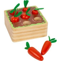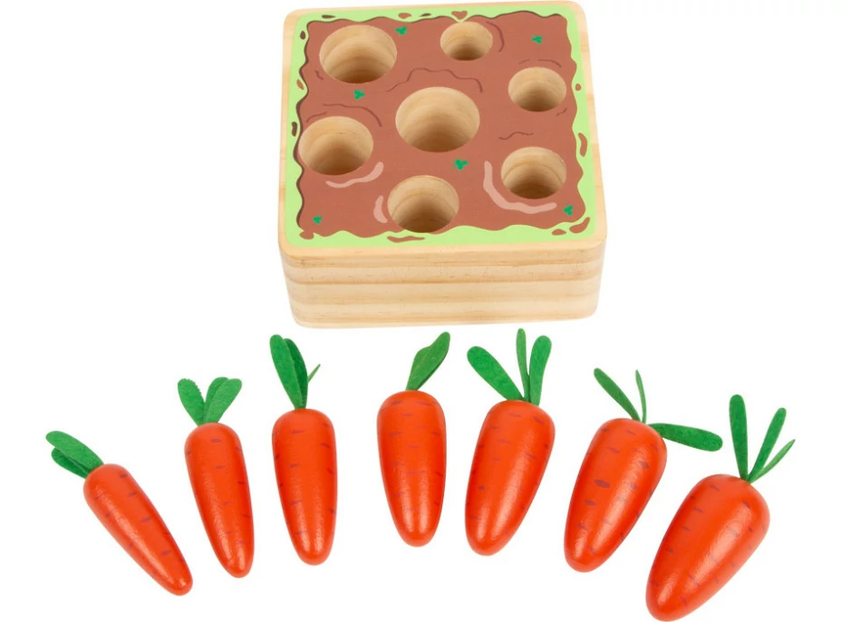 Vzdelávacia hra inšpirovaná pedagogickou metódou Montessori. Hra vkladanie a triedenie tvarov so siedmimi mrkvami rôznych veľkostí. Učenie zábavnou formou, deti môžu pri triedení a vkladaní porovnávať veľkosti. Trénuje jemnú motoriku, postreh, porozumenie veľkostiam. Zelené plstené časti robia design mrkvou realistickým. Perfektný aj pre hranie na role, pre mladých záhradníkov. Vyrobené z robustného dreva, pestrej farby, design bezpečný pre deti.