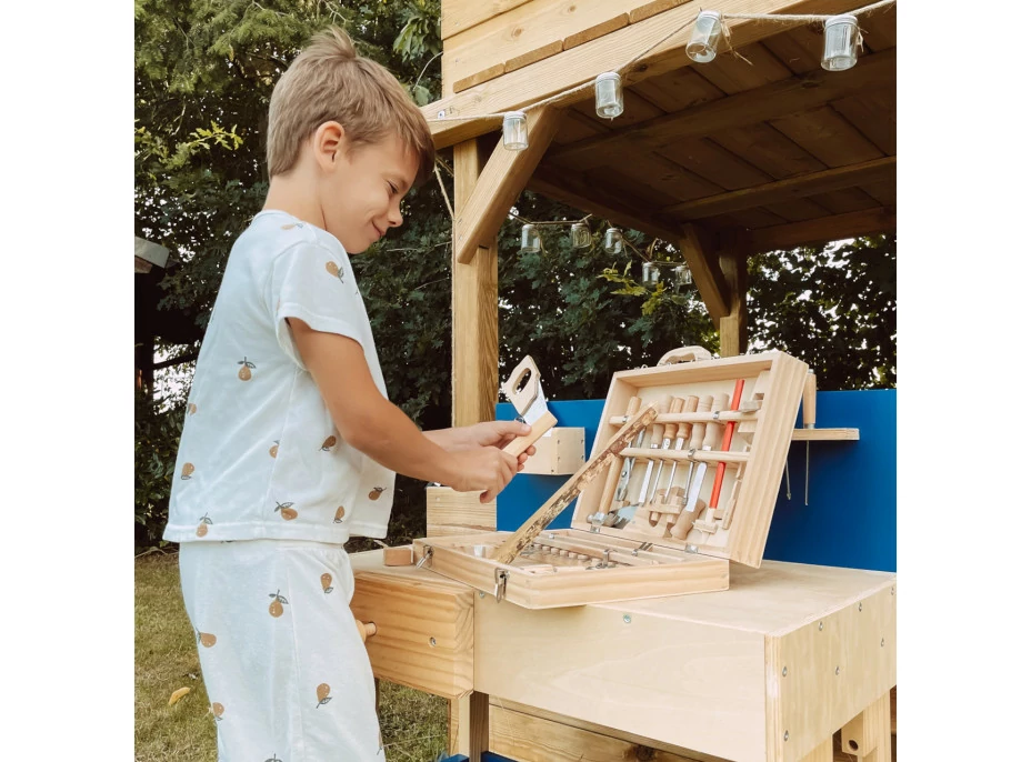 Kufrík Deluxe je komplexná sada náradia: Závesná drevená krabica so 48 dielmi pre malých domácich majstrov! V kufríku Deluxe nájdete všetko potrebné drevené aj kovové náradie pre všetky druhy prác a opráv. Nájdete v ňom kľúče, skrutkovače, pílu, nožnice, dláto, tesársku ceruzku, šesťhranný kľúč, kladivo a ďalšie! Každá položka má svoje miesto v kufri, všetky diely sú vybavené poistkami, ktoré ich na svojom mieste držia.