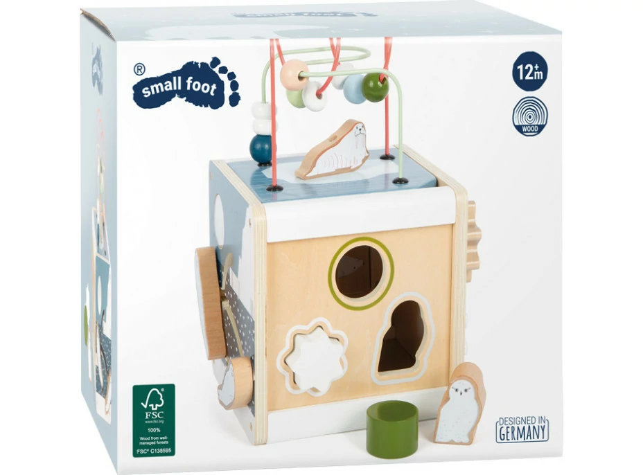 Motorická zábava s polárnym králikom, ľadovým medveďom, tuleňom a všetkými ich priateľmi. Táto motorická kocka je vyrobená zo 100% certifikovaného dreva FSC®. Ponúka toho veľa na preskúmanie na svojich piatich hrateľných stranách. Napríklad dve korálkové bludiská, vkladanie tvarov, posuvné bludisko, točiace sa doštičky alebo ozubené kolieska. Poskytuje tak deťom dlhotrvajúcu zábavu a rozmanité príležitosti na učenie. Tuleň, mrož, ľadový medveď a ďalšie arktické zvieratá sprevádzajú malých prieskumníkov na každej strane kocky a zábavnou formou vzbudzujú zvedavosť. Motorická kocka má odnímateľné veko, takže je možné uložiť dovnútra kocky zvieratka alebo tvary, ktoré dieťa práve nepoužíva. Otáčanie, vkladanie, posúvanie, točenie, skúmanie inšpiruje fantáziu, ale tiež trénuje zručnosť, jemnú motoriku a rozpoznávanie farieb a tvarov a zároveň učí následku. Vďaka svojim moderným farbám, vysokému množstvu dreveného materiálu a arktickým vzorom je táto kocka skutočným pútačom v detskej izbe. Má zaoblené hrany pre príjemný haptický zážitok.