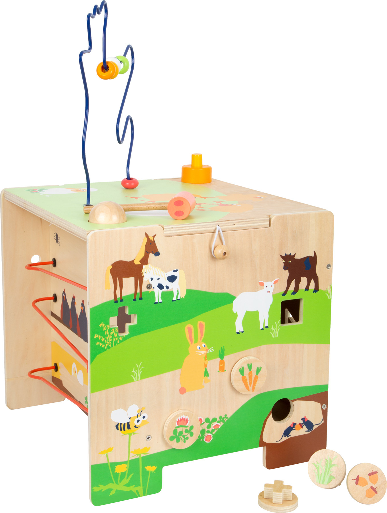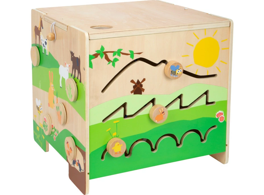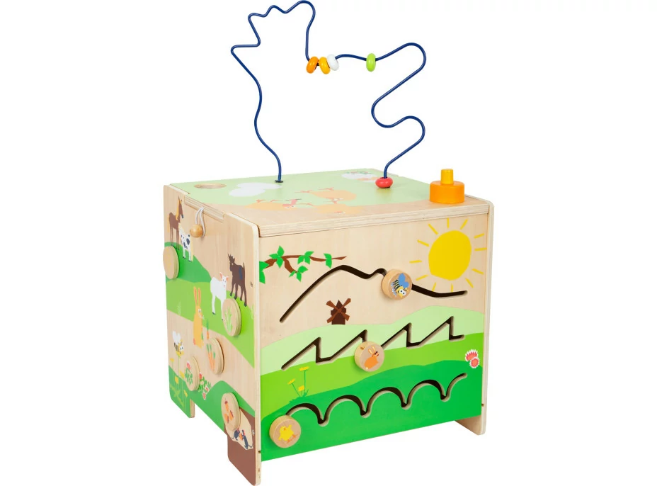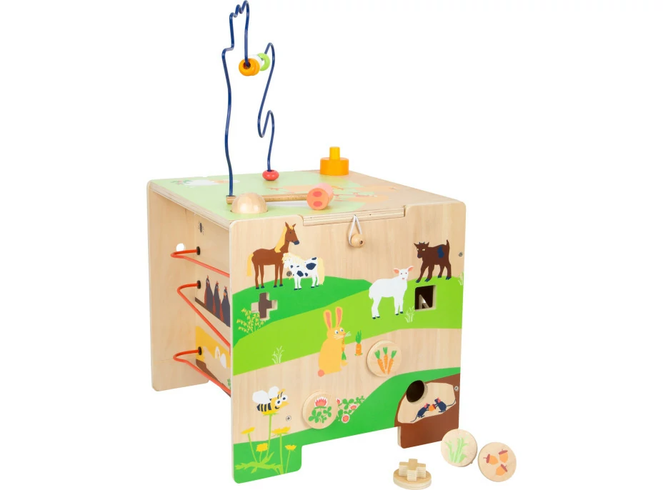Na dedine sa toho deje skutočne veľa. Korálkový labyrint v tvare sliepočky, vkladačka, posuvné dieliky, hra zoradenia farieb, zatĺkanie kladivkom, deti sa môžu hrať na všetkých piatich stranách kocky. Motorická kocka má peknú ilustráciu zvieratiek z farmy. Vrchnú stranu s labyrintom môžete odviazať a otočiť, aby ste mohli kocku skladovať bezpečne alebo z nej vytvorili stoličku pre deti. Kto čo je? Vo vkladačke musia deti nakŕmiť zvieratká správnou potravou. Motorická kocka trénuje poznávanie farieb a tvarov, aj deťom dodá základné informácie o zvieratách farmy. Unikátna motorická kocka vyrobená z dreva s kovovými prvkami.