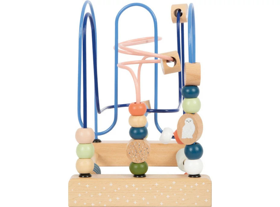 Motorická zábava v Arktíde! Táto motorická hračka vyrobená z certifikovaného dreva FSC® ponúka dlhotrvajúcu zábavu, keď sú drevené korálky a posuvné prvky s ilustráciami ľadového medveďa, tulene a sovy snežnej vedené po troch farebne zladených, prepletených kovových dráhach. Zábavnou formou si tak deti precvičia jemnú motoriku a koordináciu ruka-oko. Počítadlá s krúžkami ponúkajú rozmanitosť a podporujú záujem o počítanie zábavnou formou. Labyrint v moderných farbách podporuje motorický vývoj detí a pôsobí skvelým vizuálnym dojmom v detskej izbe. S radom motorických hračiek "Arctic" je to všetko o šiestich zvieracích kamarátoch a ich živote v mrazivom arktickom prostredí...majestátny ľadový medveď, hravý mrož, zvedavý tuleň, vrtký zajac snežný, biela sova snežná a múdra polárna líška. Všetci títo obyvatelia Arktídy majú svoje charakteristické biele kožúšky a sú obzvlášť populárne a obľúbené u malých detí. Labyrint pomáha deťom zoznamovať sa nielen s farbami, ale predovšetkým trénovať jemnú motoriku pri posúvaní korálikov. Vďaka dostatočnému množstvu týchto rozmanitých korálikov, medzi ktorými nájdete roztomilé zvieracích kamarátov, možno hračku využiť aj k edukatívnej hre a pomaly u vašich ratolestí vytvárať pozitívny vzťah k učeniu a počtu.