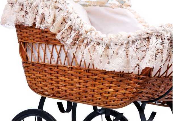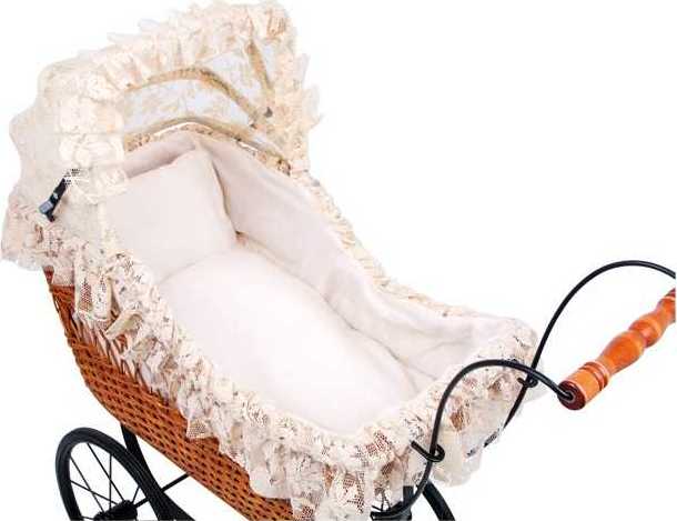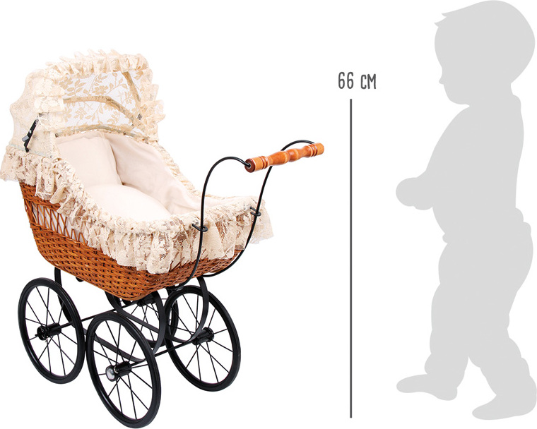 Kočík pre bábiky vo vintage štýle, sa bude svojim prepychovým prevedením vynímať či už ako hračka, alebo dekorácia. Striešku z luxusnej čipky je možné sklápať. Kočík má lakovanú drevenú rukoväť a kovový rám pre väčšiu stabilitu. Gumové kolesá zaisťujú pri jazde tichý chod. Súčasťou balenia je nadýchaný vankúšik a perinka.
