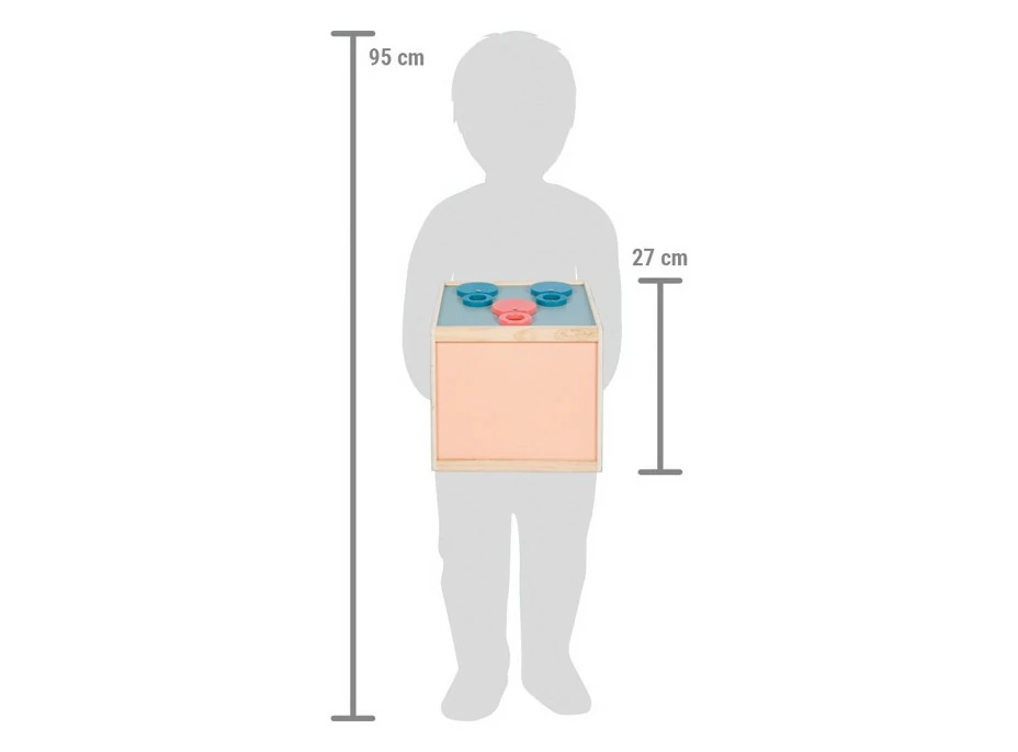 Zbystrite svoje zmysly hravou formou. Tento priestranný senzorický a hmatový box z produktového radu "Sensory" s dvoma bočnými otvormi ponúka množstvo možností pre objavovanie predmetov rôznymi spôsobmi - dotykom, videním, čuchom a sluchom. Hračka bola navrhnutá na podporu rozvoja zmyslov a motorických zručností. Je vhodná aj na ergoterapeutické účely. Lupa, fazetová šošovka a červená šošovka umožňujú nový pohľad na predmety, ktoré majú byť preskúmané vo vnútri boxu. Tri drevené šošovky je možné ľahko vybrať. Otvory na hornej strane je možné potom použiť na prezeranie, očuchavanie a počúvanie. Uhlom otvorenia zadných dvierok a horných výklopných klapiek je možné regulovať množstvo svetla, ktoré do boxu preniká. Drevený box je možné plniť rôznymi predmetmi cez zadné dvierka s magnetickou západkou. Látkové návleky na bočných otvoroch zakrývajú pohľad dovnútra boxu a zároveň zaisťujú príjemne mäkký prístup. Veľkosťou sú vhodné pre deti aj dospelých. Vysoko kvalitný a zaujímavý zmyslový box v moderných farbách sľubuje všestrannú a dlhotrvajúcu zábavu. Či už sa hrá ako pamäťová hra, alebo ako hra na hľadanie, alebo ako hra na rozpoznávanie – je to zaujímavá, hmatová a zmyslová hra, ktorú je možné hrať samostatne alebo s viacerými hráčmi, pre ešte väčšiu vzrušujúcu zábavu. Rukávniky sú pripevnené pomocou suchých zipsov, vďaka čomu sú odnímateľné, takže ich možno prať v ruke na nízku teplotu.