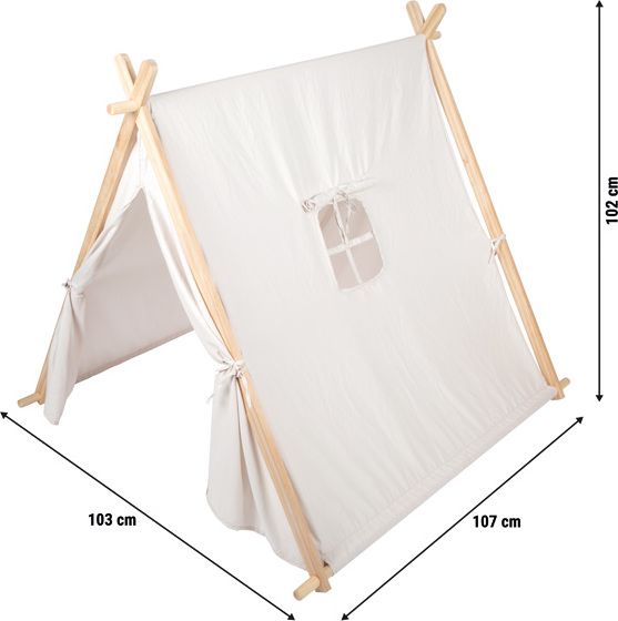 Hrajte sa, snívajte, odpočívajte. Tento štýlový herný stan pre vnútorné použitie z pevného dreva a kvalitnej látky je dokonalým útočiskom pre nápaditú a kreatívnu hru v detskej izbe. Robustná drevená konštrukcia a jemný látkový poťah vytvárajú útulné miesto na hranie, čítanie i maznanie. Bočné okienko prepúšťa dostatok svetla, zatiaľ čo zrolovateľný vstup umožňuje otvorený prístup dovnútra. Stan sa tak ľahko premení na tábor pre malých dobrodruhov, domček pre bábiky a plyšáky alebo pokojný čítací kútik. Moderný dizajn s jemnými farbami sa hodí do každého interiéru a dodá detskej izbe hrejivú atmosféru. Vďaka mnohým možnostiam využitia sa tento herný stan rýchlo stane obľúbeným miestom všetkých malých objaviteľov.