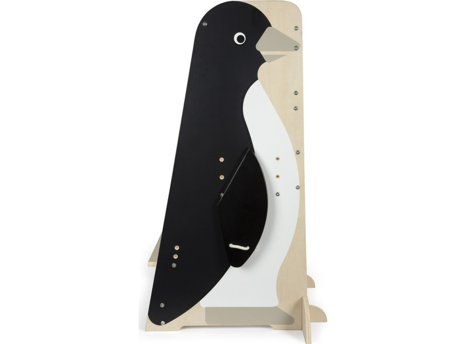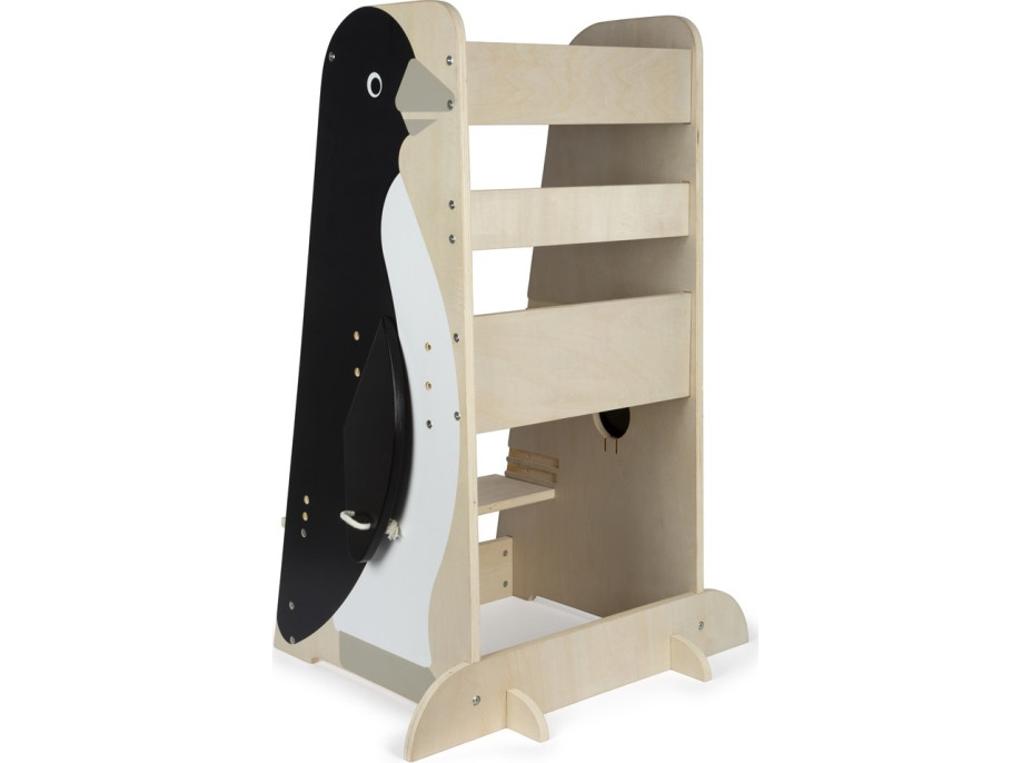 Učiace veže umožňujú najmenším deťom byť v úrovni pracovnej dosky, vidieť všetko, čo robíte, a pracovať s Vami. Pokiaľ chcete, aby Vaše dieťa bolo súčasťou bežných činností pri kuchynskej linke, v kúpeľni alebo pri pracovnom stole, učiaca a pozorovacia veža v dizajne tučniaka sa určite stane Vašim každodenným pomocníkom. Je robustný a stabilný a vďaka nej sa deti môžu zapojiť do všetkého diania v domácnosti v rovnakej výške ako dospelí. Má výškovo nastaviteľnú plošinu a schodík, porastie teda s dieťaťom, a zábrana zaistí jeho bezpečnosť. Skladacie krídla tučniaka poskytujú úložný priestor pre utierky, chňapky a ďalšie drobnosti. Pri používaní nenechávajte učiacu vežu v priestore, ale vždy vežu umiestnite stranou oproti schodíku k pevnej prekážke (kuchynská linka a pod.).