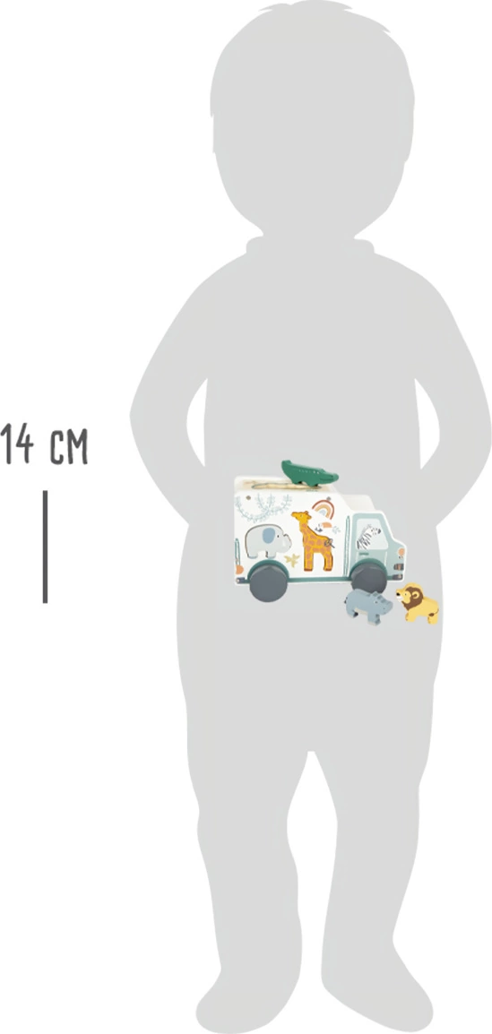 Vkladacia hračka a drevené autíčko v jednom. Drevená vkladačka v populárnom safari designe. Žirafa, hroch, lev a ich kamaráti sú pripravení na výlet do divočiny so zebrou vodičkou. Safari minibus má päť vkladacích otvorov, pre každé zviera jeden. Krásna hračka, ktorá trénuje rozpoznávanie tvarov a motoriku. Auto má mnoho detailov a dosť miesta pre roztomilé figúrky. Dlhotrvajúca zábava v každej detskej izbičke!