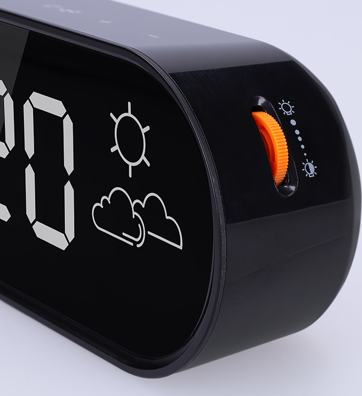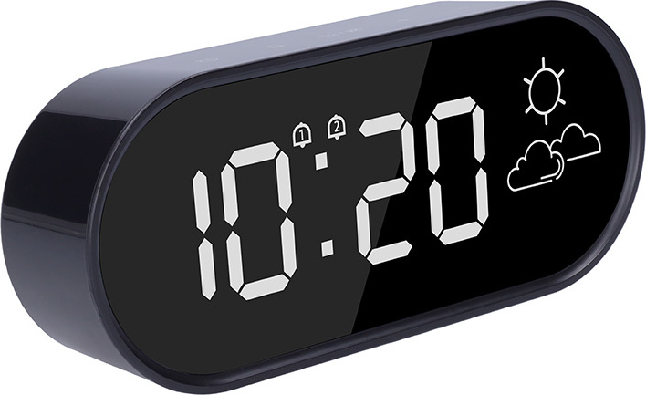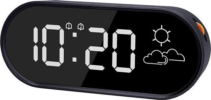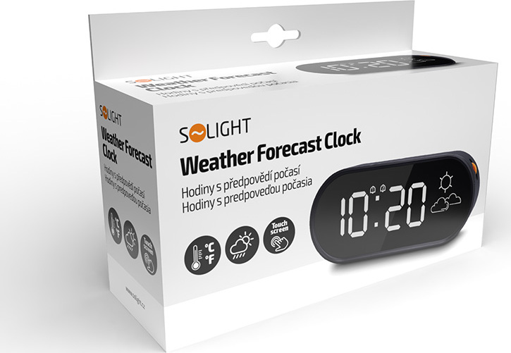 Hodiny s predpoveďou počasia, budíkom a USB nabíjaním. Tento moderný digitálny budík s funkciou predpovede počasia na základe zmien atmosférického tlaku kombinuje štýlový design s dotykovým ovládaním. Displej umožňuje zobrazenie času alebo striedanie času a teploty, ktorú je možné prepínať medzi °C/°F. Dvojitý budík s funkciou odloženia (snooze) zaručí pohodlné budenie. Jas displeja je možné regulovať otočným kolieskom. Praktický USB port umožňuje nabíjanie ďalších zariadení.