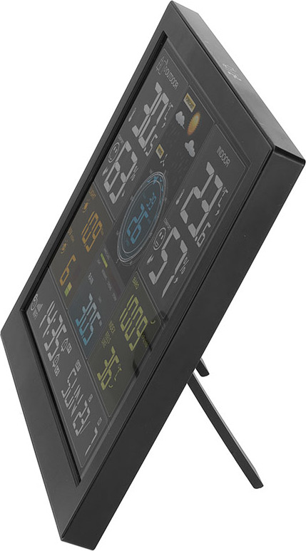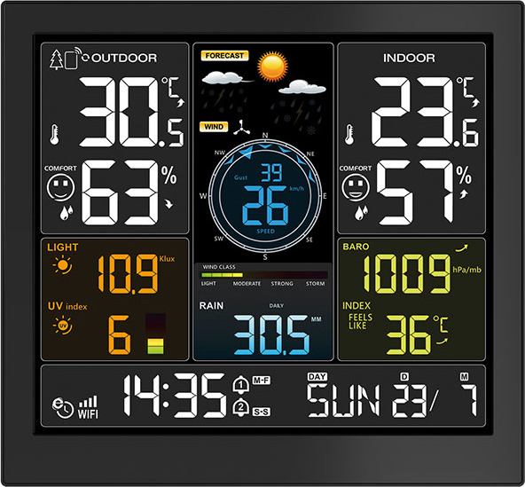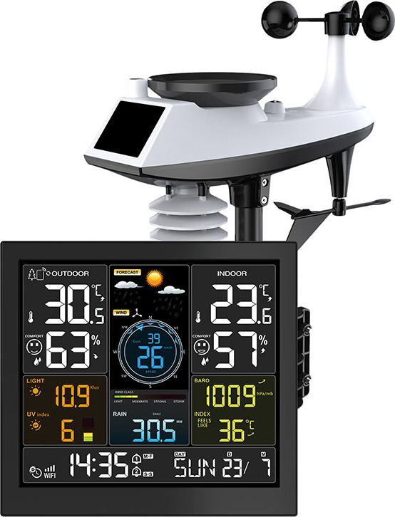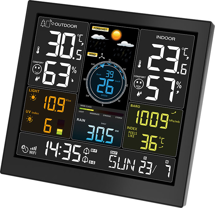 Táto profesionálna meteostanica s veľkým 24,4 cm displejom ponúka WiFi pripojenie a prepojenie s aplikáciou Tuya/Smart Life pre zobrazenie aktuálnych hodnôt a štatistík. Meria vnútornú (-20 °C až 50 °C) a vonkajšiu teplotu (-40 °C až 70 °C), vlhkosť (20 % až 95 %), rýchlosť vetra (0 až 180 km/h), smer vetra (0–359 °), zrážky (0 až 9999 mm), atmosférický tlak (60 (0-128 klux) a UV index (0-15). Ponúka automatickú synchronizáciu času, zobrazenie dňa v týždni v 15 jazykoch, dva denné budíky so snooze funkciou (5–60 min alebo vypnuté) a kalendár do roku 2099. Predpoveď počasia na 12 hodín využíva tlak vzduchu a zobrazuje ikony ako slnečno, oblačno, dážď alebo sneženie. Bezdrôtové senzory s dosahom až 100 m umožňujú pripojenie 1× multi-combination senzora a až 3 teplotných/vlhkostných senzorov. Napájanie DC 5V / 1A adaptér + záložný 2× AA batérie, senzory na AAA batérie. Vďaka prepojeniu s aplikáciou, širokej škále meraní a precíznemu spracovaniu je ideálnou voľbou pre všetkých, ktorí chcú mať meteorologické dáta vždy po ruke.