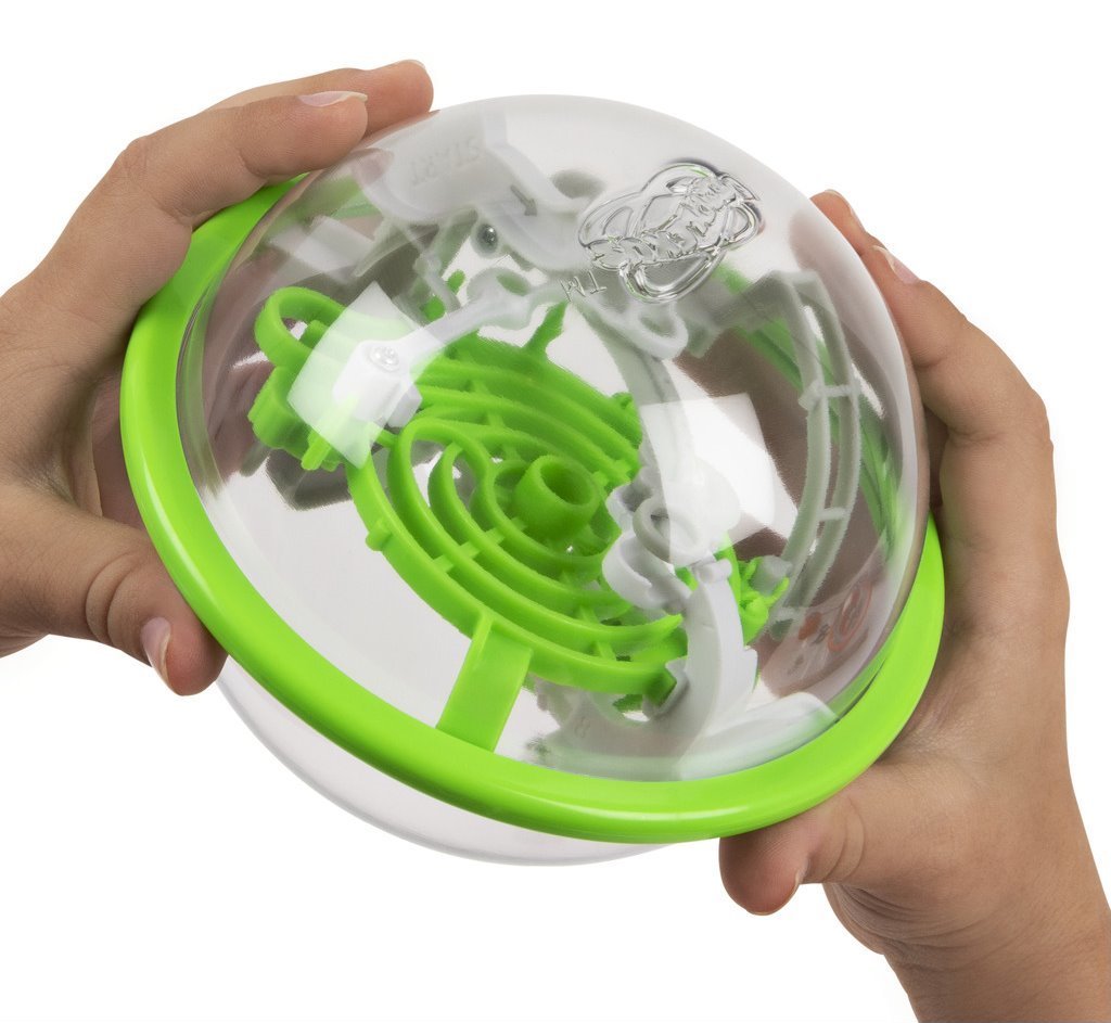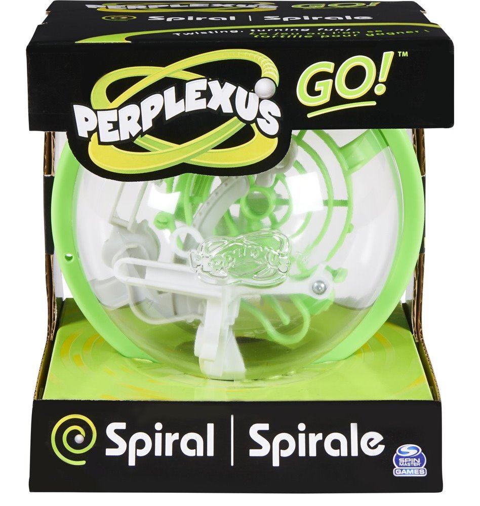 Cestovné 3D hlavolam s bludiskom Perplexus Go! Spiral, v ktorom musíte navigovať malú oceľovú guľôčku cez ťažké 360 ° prekážky vo vnútri priehľadnej plastovej gule.