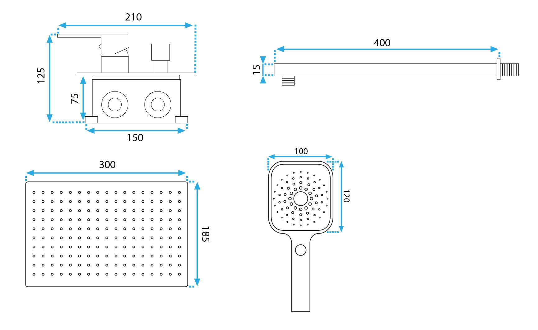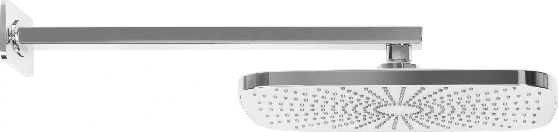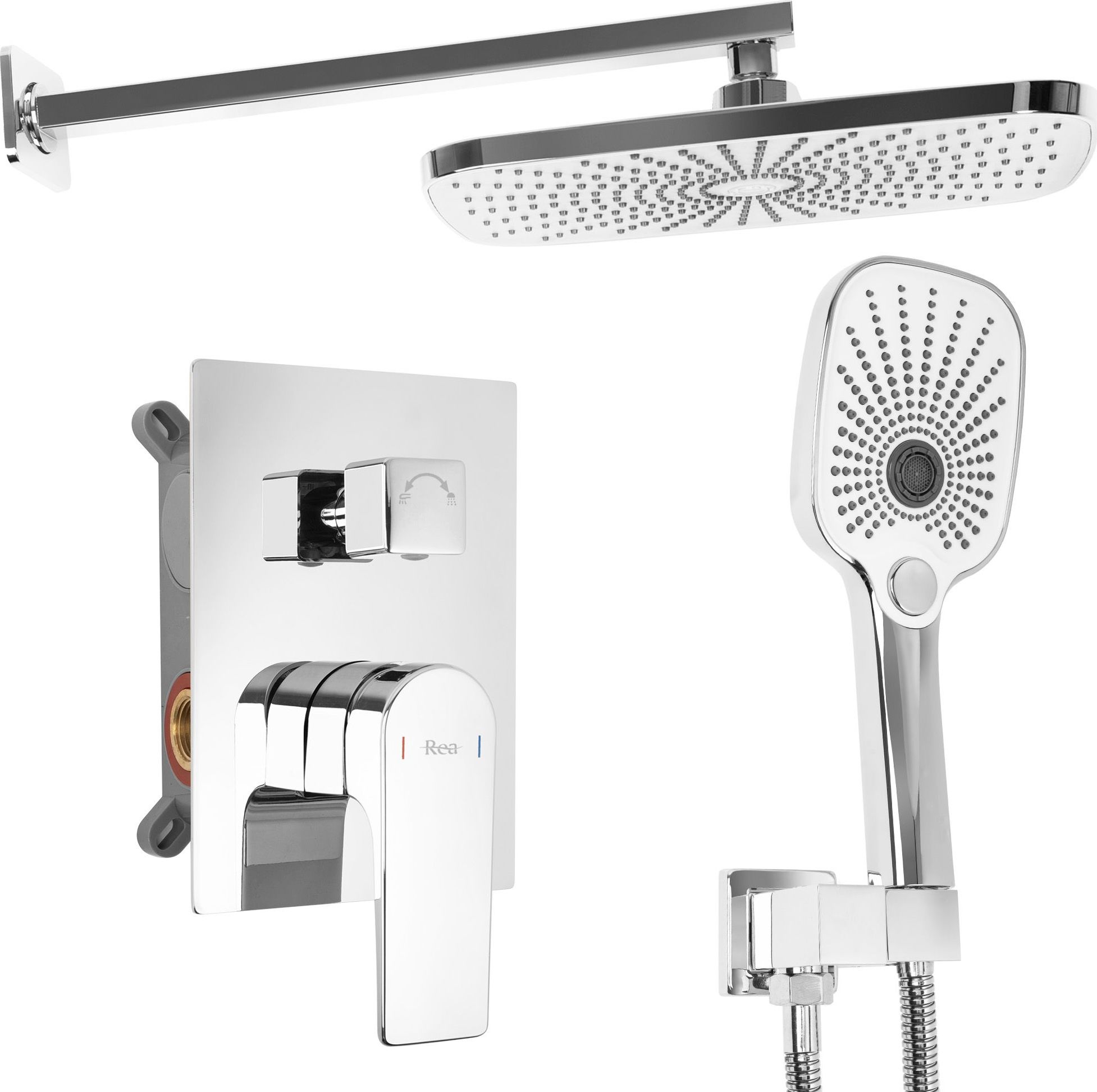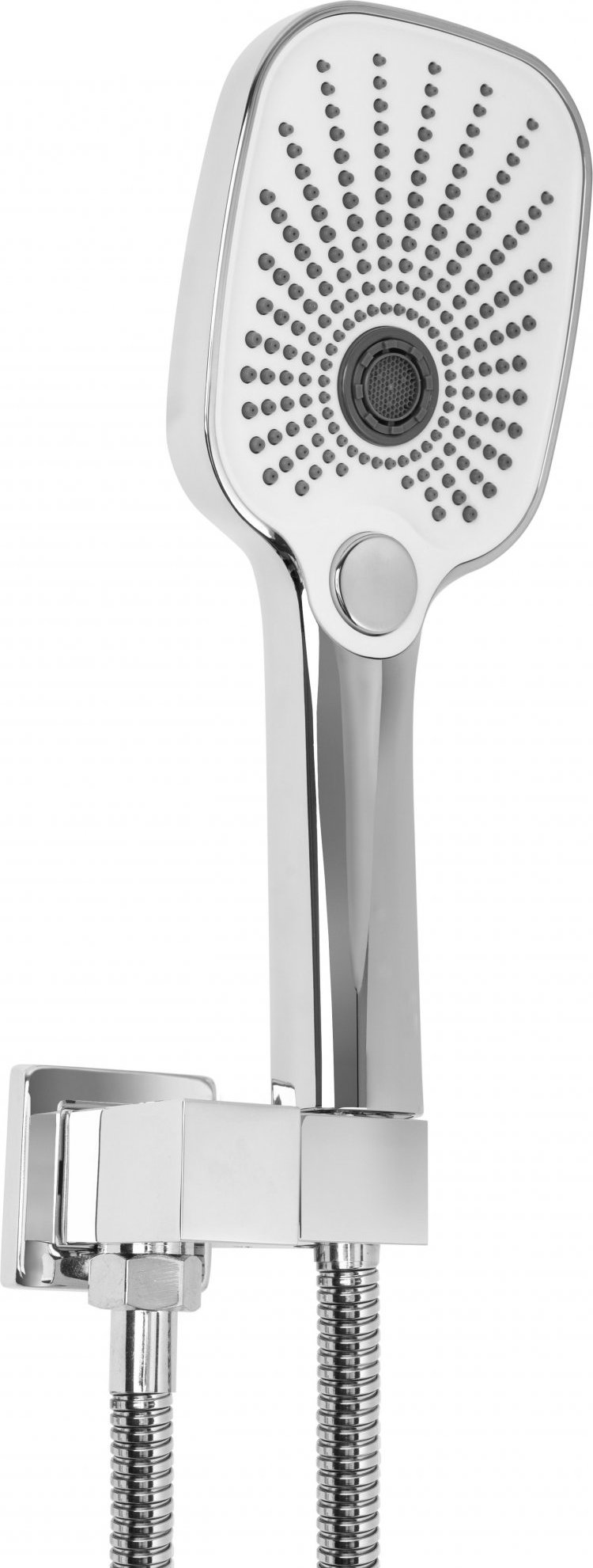 Moderná podomietková súprava v chrómovom lesklom prevedení sa skladá z batérie s mosadznou podomietkovou konštrukciou s krycou doskou vyrobenou z nerezovej ocele, hornej sprchovej hlavice z plastu, vývodu s držiakom ručnej sprchy z mosadze, opletené 150cm hadicou na ručné sprchy z plastu.