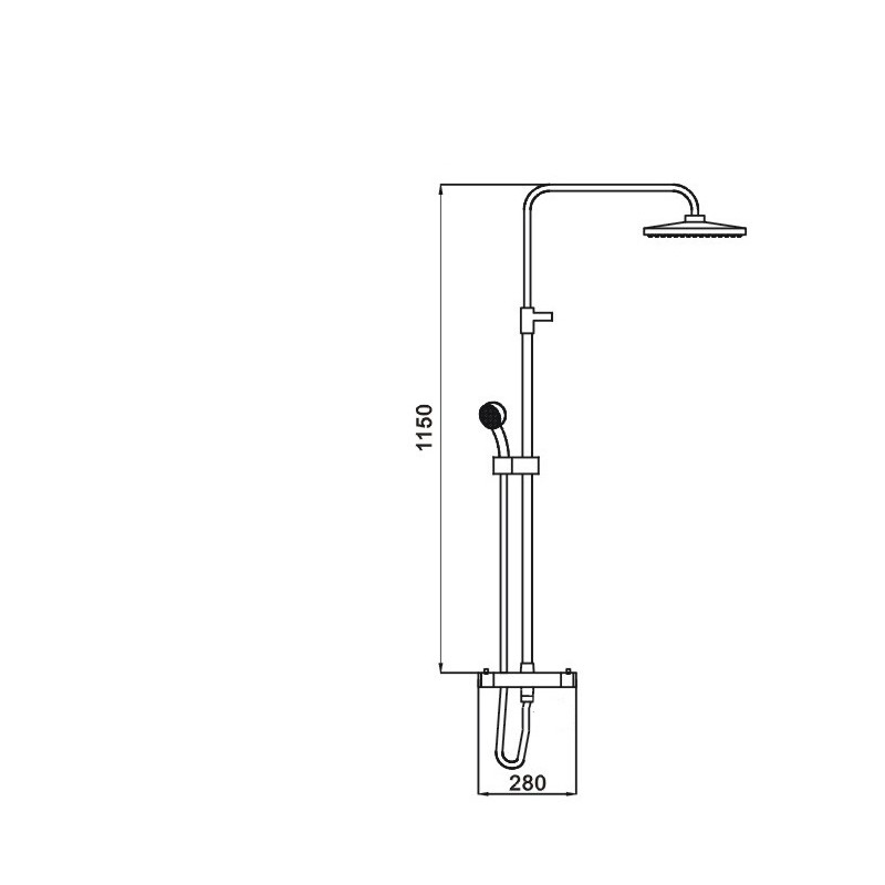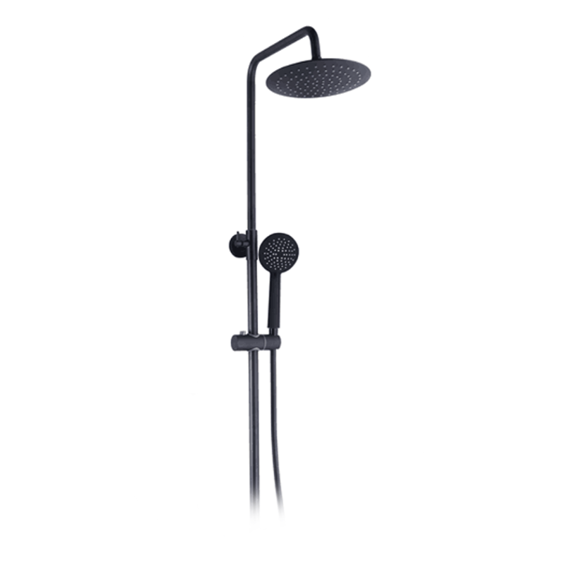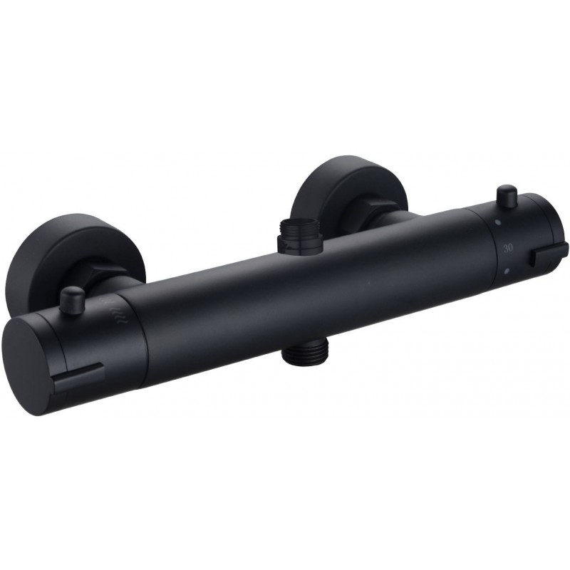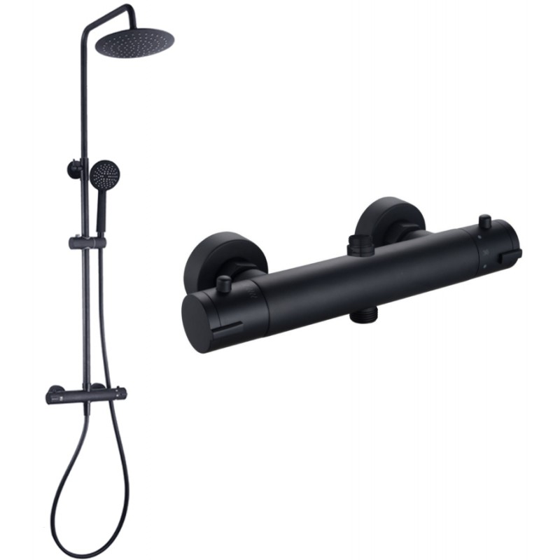 Moderná nástenná sprchová súprava s termostatickou batériou z mosadze. Kovová tyč s výškou 115 cm a čiernou matnou povrchovou úpravou je pripevnená k batérii a má vo vrchnej časti pripevnenie do steny. Súčasťou tyče je tiež držiak na ručnú sprchu a vrchná dažďová sprchová hlavica s kĺbom, ktorý dovoľuje mierny náklon hlavice. Sprchová hadica dlhá 150 cm má štandardné 1/2 "pripojenie na batériu, takže v prípade potreby ju ľahko vymeníte.