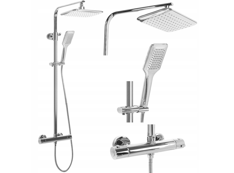Moderná nástenná sprchová súprava s termostatickou batériou z mosadze. Kovová tyč s nastaviteľnou výškou a chrómovou povrchovou úpravou je pripevnená k batérii a má vo vrchnej časti pripevnenie do steny. Súčasťou tyče je aj držiak na ručnú sprchu a vrchná dažďová sprchová hlavica s kĺbom, ktorý dovoľuje mierny náklon hlavice. Sprchová hadica dlhá 150 cm má štandardné 1/2" pripojenie na batériu, takže v prípade potreby ju ľahko vymeníte.