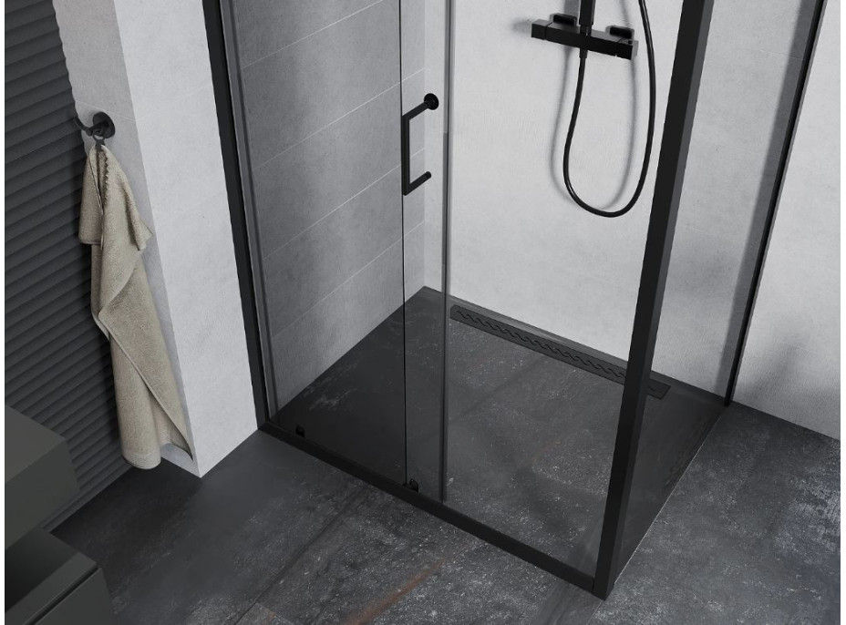 Skvelá voľba do každej kúpeľne. Elegantný sprchový kút je vyrobený z 5 mm hrubého tvrdeného číreho skla. Aplikovaná povrchová úprava skla zaisťuje maximálny komfort všetkým užívateľom. Táto technológia zaručuje jedinečné vlastnosti zabraňujúce znečisteniu skla - povrch stačí iba opláchnuť vodou. Kút je uchytený v čiernych hliníkových profiloch a je vybavený tesnením zabraňujúcim úniku vody mimo sprchovací kút. Dvere sprchovacieho kúta sú posuvné (pojazdy s kvalitnými dvojitými kolieskami). Na otváranie slúži decentná kovová rukoväť.