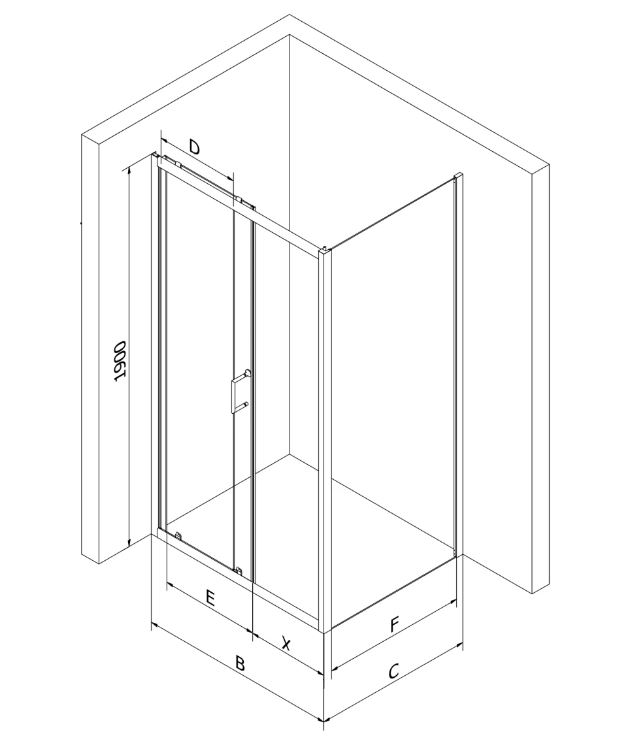 Rozmer kúta: 115x100 cm - nastaviteľný rozsah rozmeru dlhšej strany s dverami (B): 112 - 115 cm, pevná bočná stena (C): 98,5 - 100 cm, šírka vstupu (X): 48,5 cm