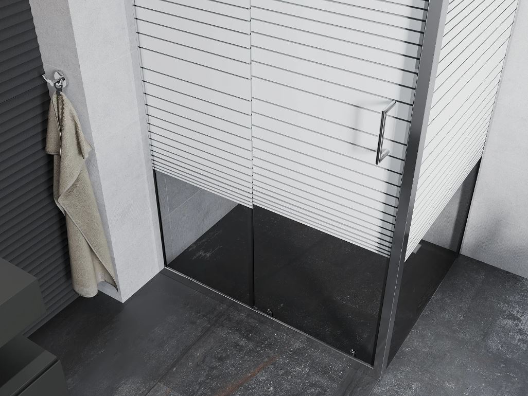 Skvelá voľba do každej kúpeľne. Elegantný sprchový kút je vyrobený z 5 mm hrubého tvrdeného skla v prevedení stripe (kombinácia číreho skla s matnými pruhmi). Aplikovaná povrchová úprava skla zaisťuje maximálny komfort všetkým užívateľom. Táto technológia zaručuje jedinečné vlastnosti zabraňujúce znečisteniu skla - povrch stačí iba opláchnuť vodou. Kút je uchytený v chrómovaných hliníkových profiloch a je vybavený tesnením zabraňujúcim úniku vody mimo sprchovací kút. Dvere sprchovacieho kúta sú posuvné (pojazdy s kvalitnými dvojitými kolieskami). Na otváranie slúži decentné kovová rukoväť.
