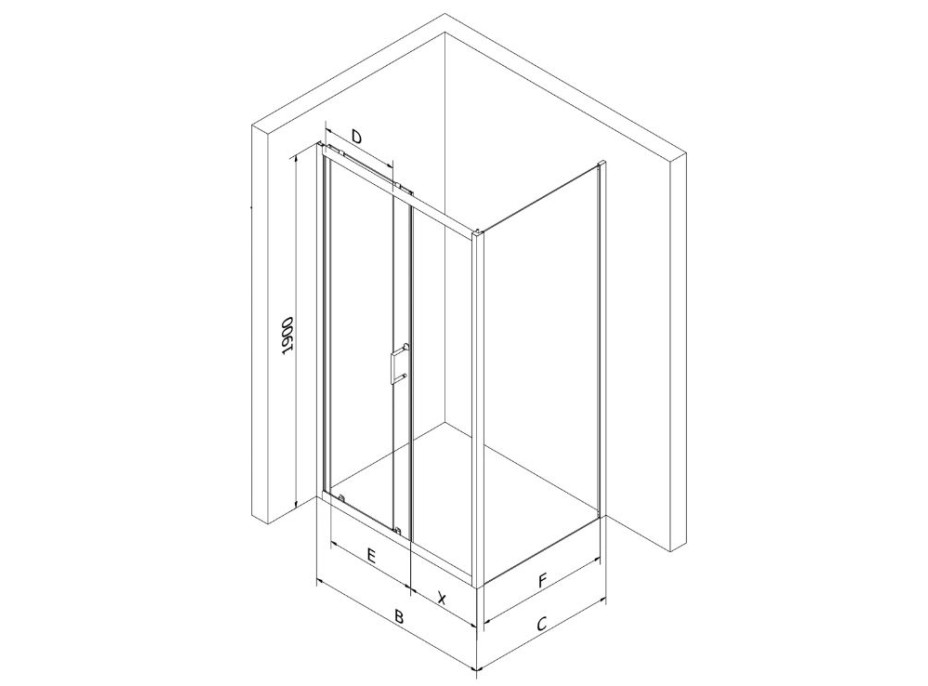 Rozmer kúta: 140x100 cm - nastaviteľný rozsah rozmeru dlhšej strany s dverami (B): 137 - 140 cm, pevná bočná stena (C): 98,5 - 100 cm, šírka vstupu (X): 61 cm
