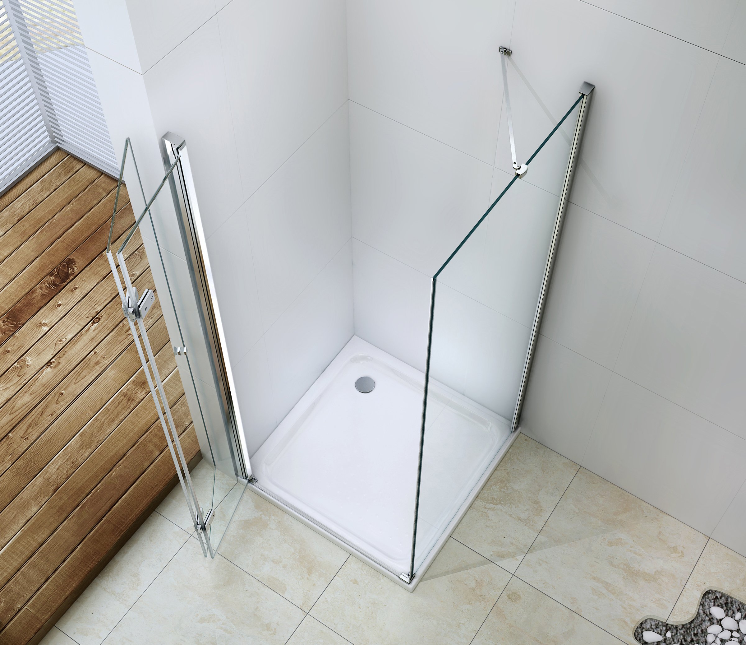 Skvelá voľba do každej kúpeľne. Elegantný sprchovací kút je vyrobený z 6 mm hrubého tvrdeného skla v čírom prevedení. Aplikovaná povrchová úprava skla zaisťuje maximálny komfort všetkým užívateľom. Táto technológia zaručuje jedinečné vlastnosti zabraňujúce znečisteniu skla - povrch stačí iba opláchnuť vodou. Kút je uchytený v chrómovaných hliníkových profiloch a je vybavený tesnením zabraňujúcim úniku vody mimo sprchovací kút. Dvere sprchového kúta sú skladacie (dve sklá spojené kvalitnými pántami s možnosťou zloženia dovnútra aj von). Na otváranie slúži decentná kovová rukoväť.