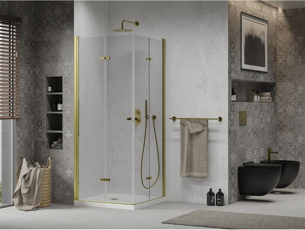 Skvelá voľba do každej kúpeľne. Elegantný sprchový kút je vyrobený zo 6 mm hrubého tvrdeného skla v čírom prevedení. Aplikovaná povrchová úprava skla zaisťuje maximálny komfort všetkým užívateľom. Táto technológia zaručuje jedinečné vlastnosti zabraňujúce znečisteniu skla - povrch stačí iba opláchnuť vodou. Kút je uchytený v hliníkových profiloch so zlatou povrchovou úpravou a je vybavený tesnením zabraňujúcim úniku vody mimo sprchový kút. Dvere sprchového kúta sú skladacie (dve sklá spojené kvalitnými pántami s možnosťou zloženia dovnútra aj von). Na otváranie slúži decentná kovová rukoväť.