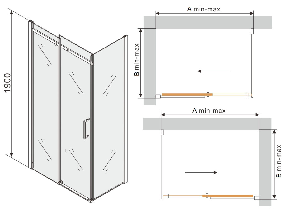 Sprchovací kút je univerzálny - pri montáži si zvolíte otváranie doprava či doľava. Skladá sa z prednej steny s posuvnými dverami (jeden diel pevný a druhý posuvný) a jednej bočnej pevnej steny. Profilové lišty umožňujú reguláciu pre vyrovnanie prípadných nerovností stien. Sprchovací kút je možné inštalovať na sprchovú vaničku alebo priamo na podlahu so sprchovacím žľabom. Vanička nie je súčasťou sprchovacieho kúta. Sprchové vaničky, odtokové žľaby a ďalšie vybavenie kúpeľní môžete dokúpiť v našom eshope.
