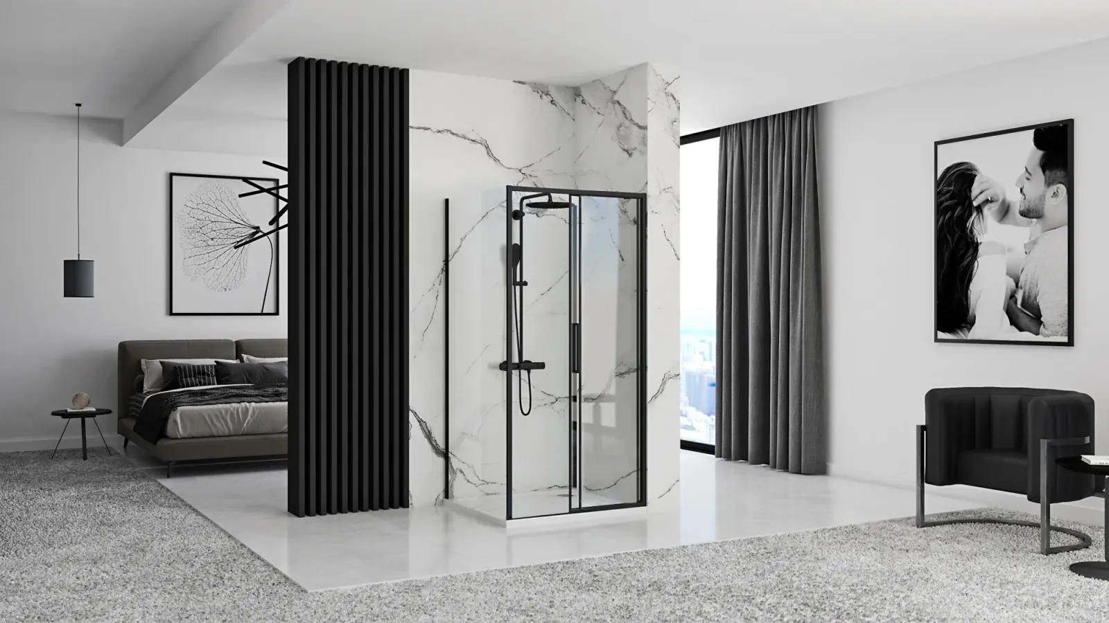 Steny kúta sú uchytené v čiernych hliníkových profiloch a sú vybavené magnetickým uzatváraním a spodným tesnením. Vďaka regulácii v profiloch možno vyrovnať mierne nerovnosti stien. Podlahová lišta s výškou 10 mm zamedzí vytekaniu vody pod dverami.