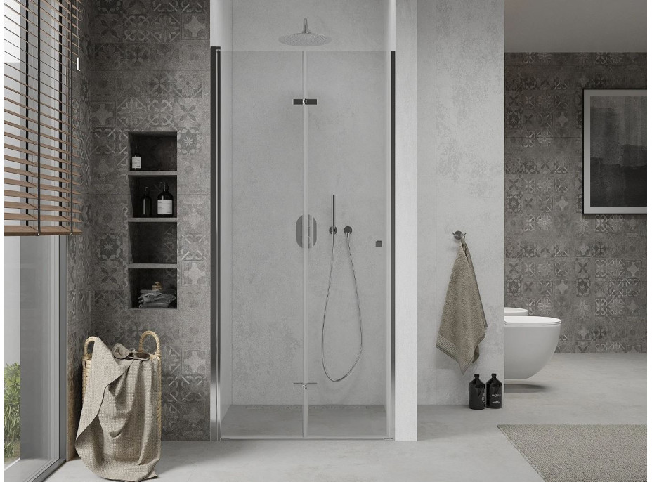 Skvelá voľba do každej kúpeľne. Elegantné sprchové dvere sú vyrobené z 6 mm hrubého tvrdeného číreho skla. Aplikovaná povrchová úprava skla zaisťuje maximálny komfort všetkým užívateľom. Táto technológia zaručuje jedinečné vlastnosti zabraňujúce znečisteniu skla - povrch stačí iba opláchnuť vodou. Dvere sú uchytené v chrómovanom hliníkovom profile a sú vybavené tesnením zabraňujúcim úniku vody mimo sprchovací kút. Sprchové dvere sú zalamovacie (dve sklá spojené kvalitnými pántami s možnosťou zloženia dovnútra aj von). Na otváranie slúži decentná kovová rukoväť.